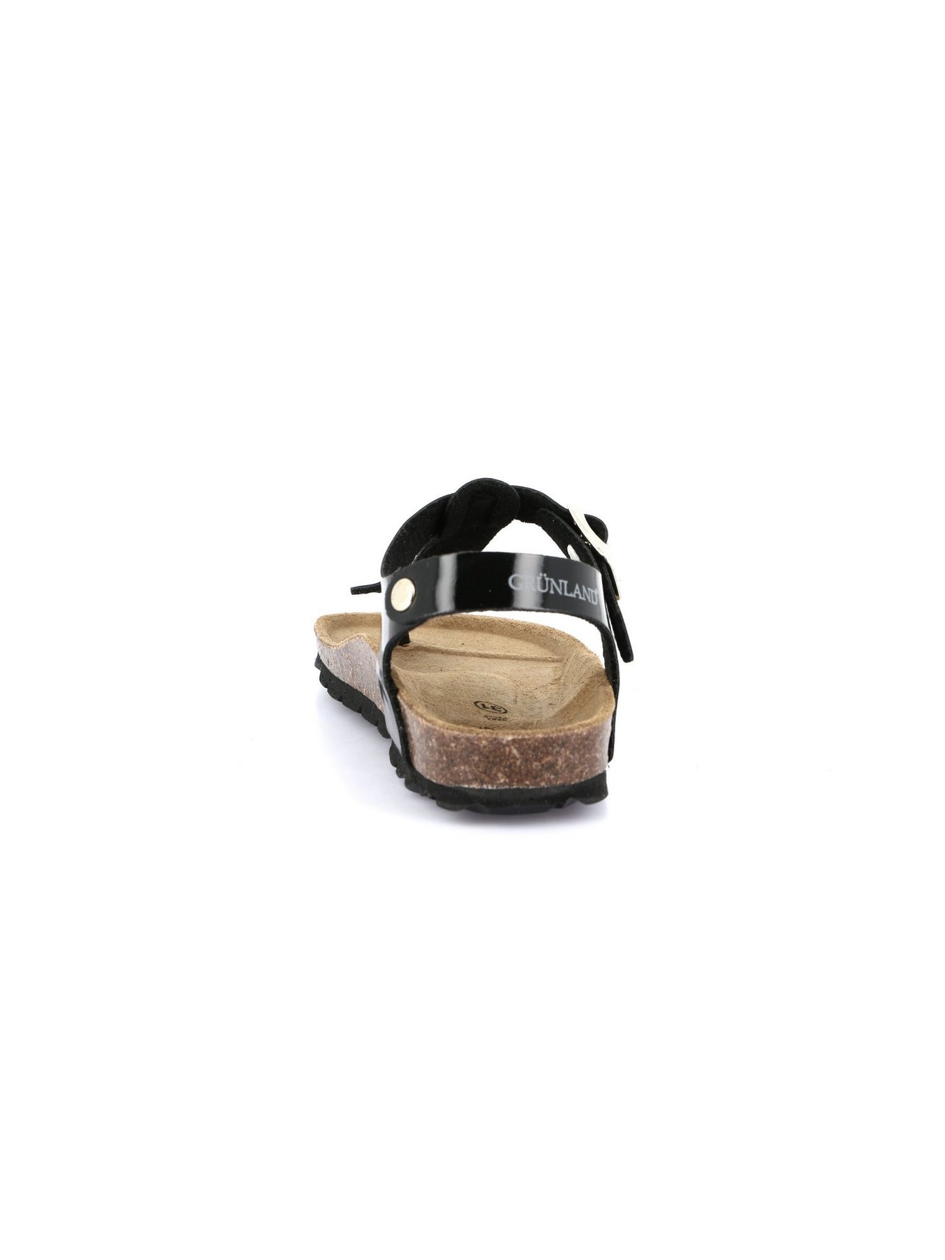 La tomaia in vernice sintetica nera con fibbia regolabile assicura una calzata stabile e personalizzata. Il sottopiede in sughero e pelle sostiene il piede in modo naturale, mentre la suola in EVA garantisce leggerezza e flessibilità, ideale per le giornate estive più dinamiche.