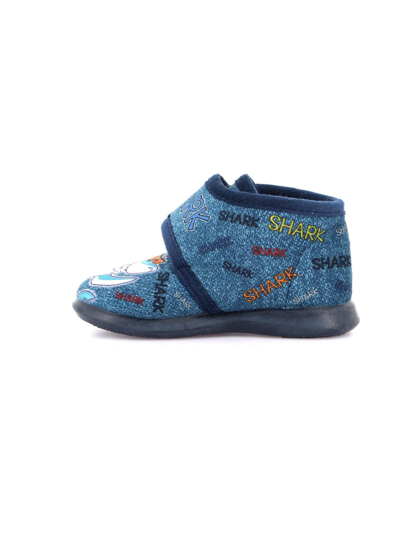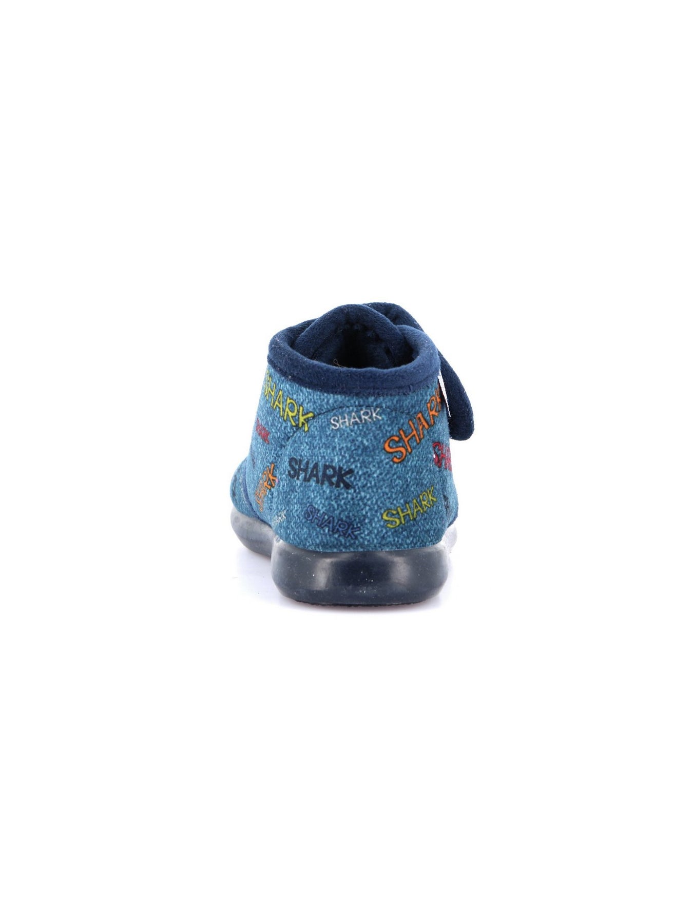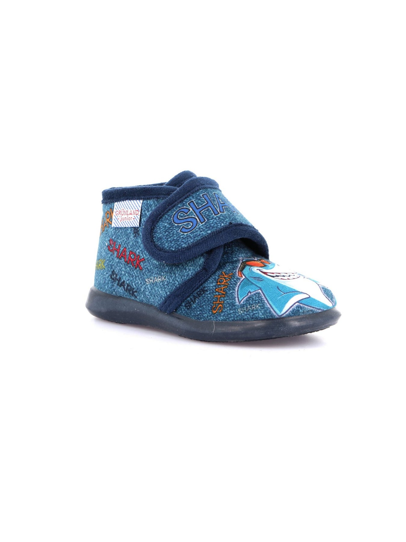 La pantofola GRUNLAND PA1256 Blu è pensata per unire comfort, praticità e divertimento nelle giornate dei più piccoli. Realizzata in tessuto blu con scritte multicolor e applicazioni a tema “Shark”, regala un look giocoso e originale.