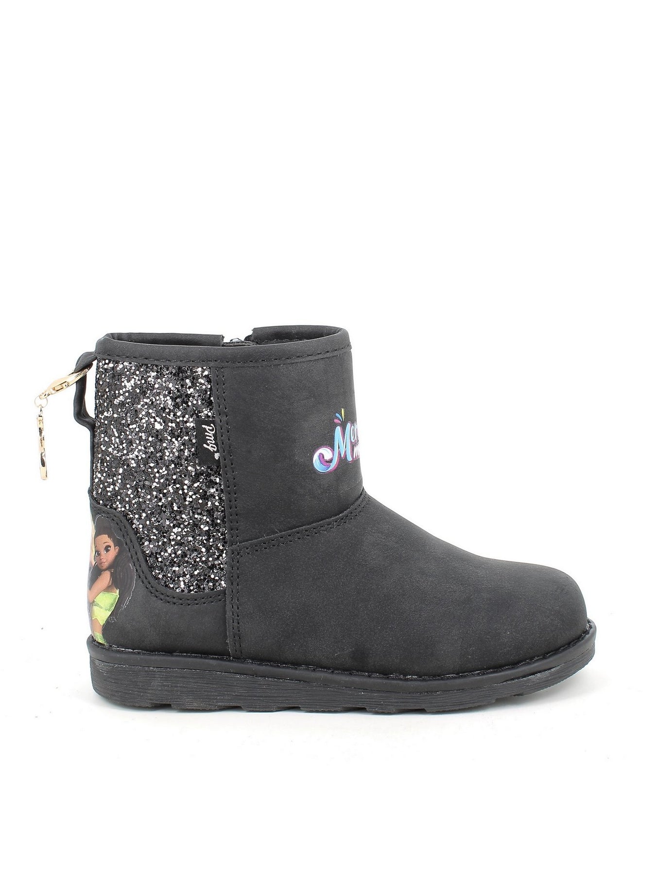 Il tronchetto Primigi AVANT 89880 è pensato per unire praticità, comfort e fantasia. Realizzato in materiale scamosciato nero, presenta una tomaia arricchita da un inserto posteriore glitterato e da decorazioni colorate dedicate al cartone Disney Encanto, che lo rendono allegro e originale.