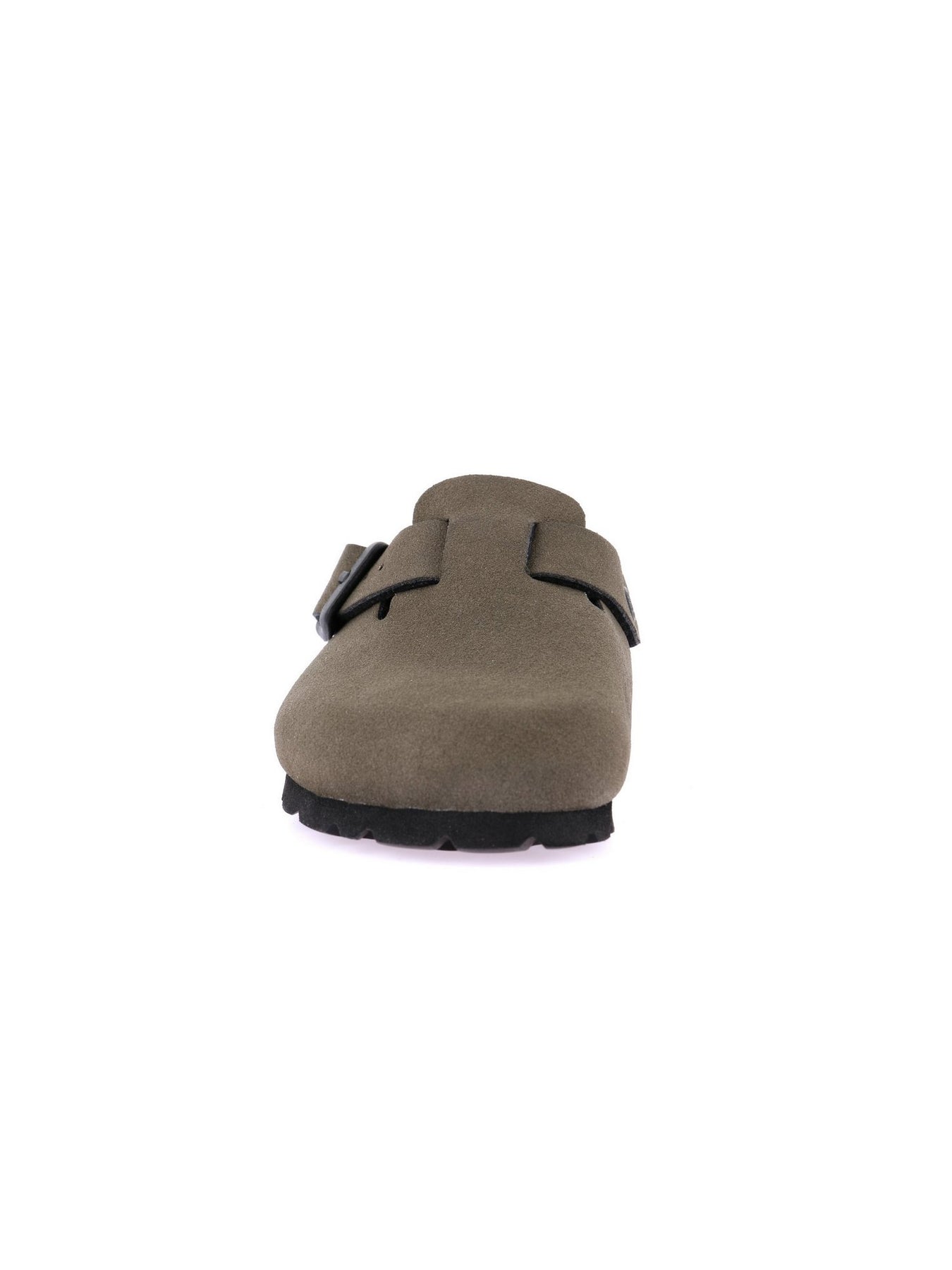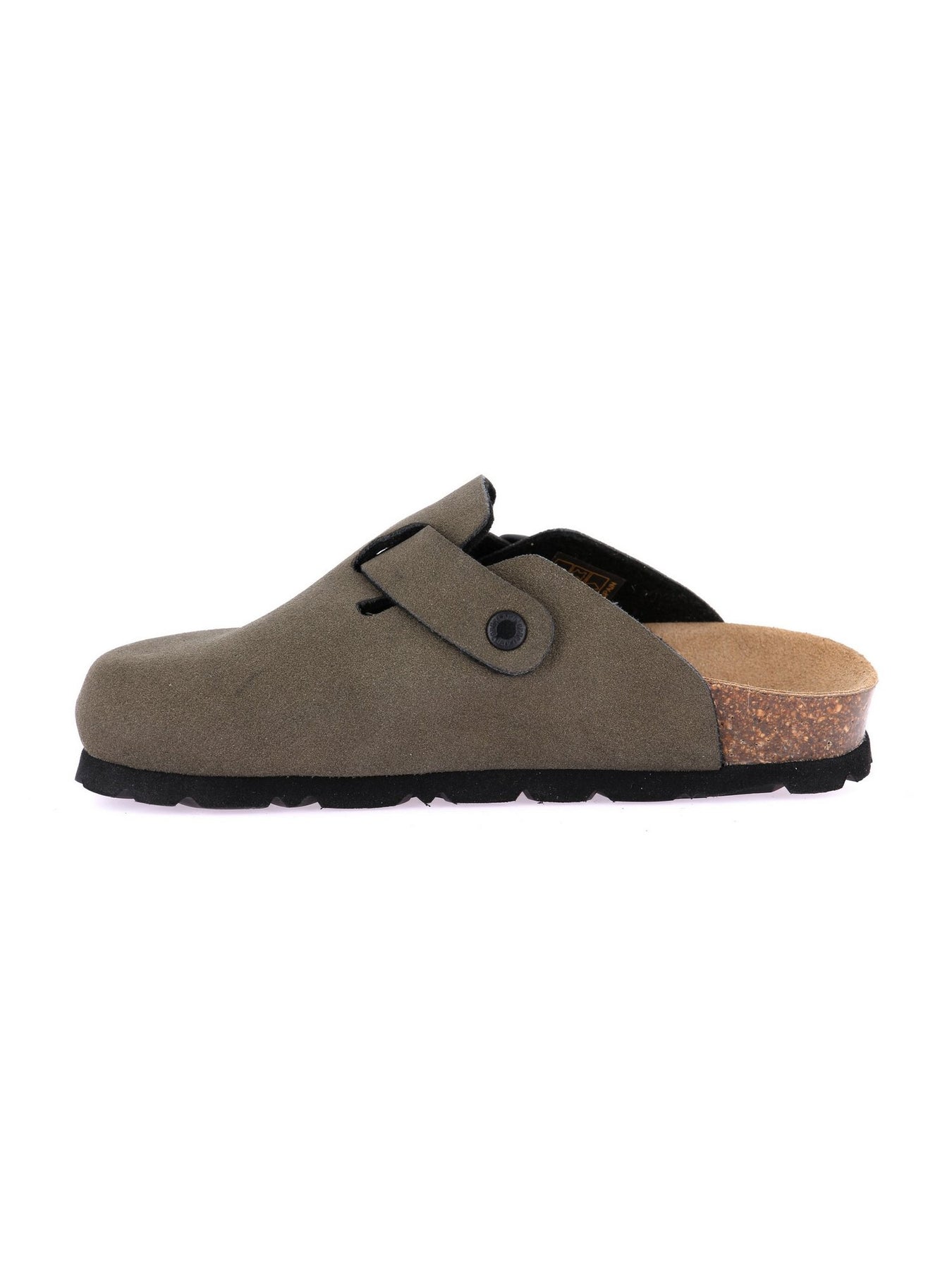 La tomaia in morbido materiale effetto scamosciato color oliva è dotata di una fibbia regolabile per una calzata sicura. Il sottopiede anatomico in sughero e pelle assicura supporto ottimale, mentre la suola in gomma flessibile garantisce stabilità e aderenza su ogni superficie. Perfetto per casa, scuola o tempo libero.