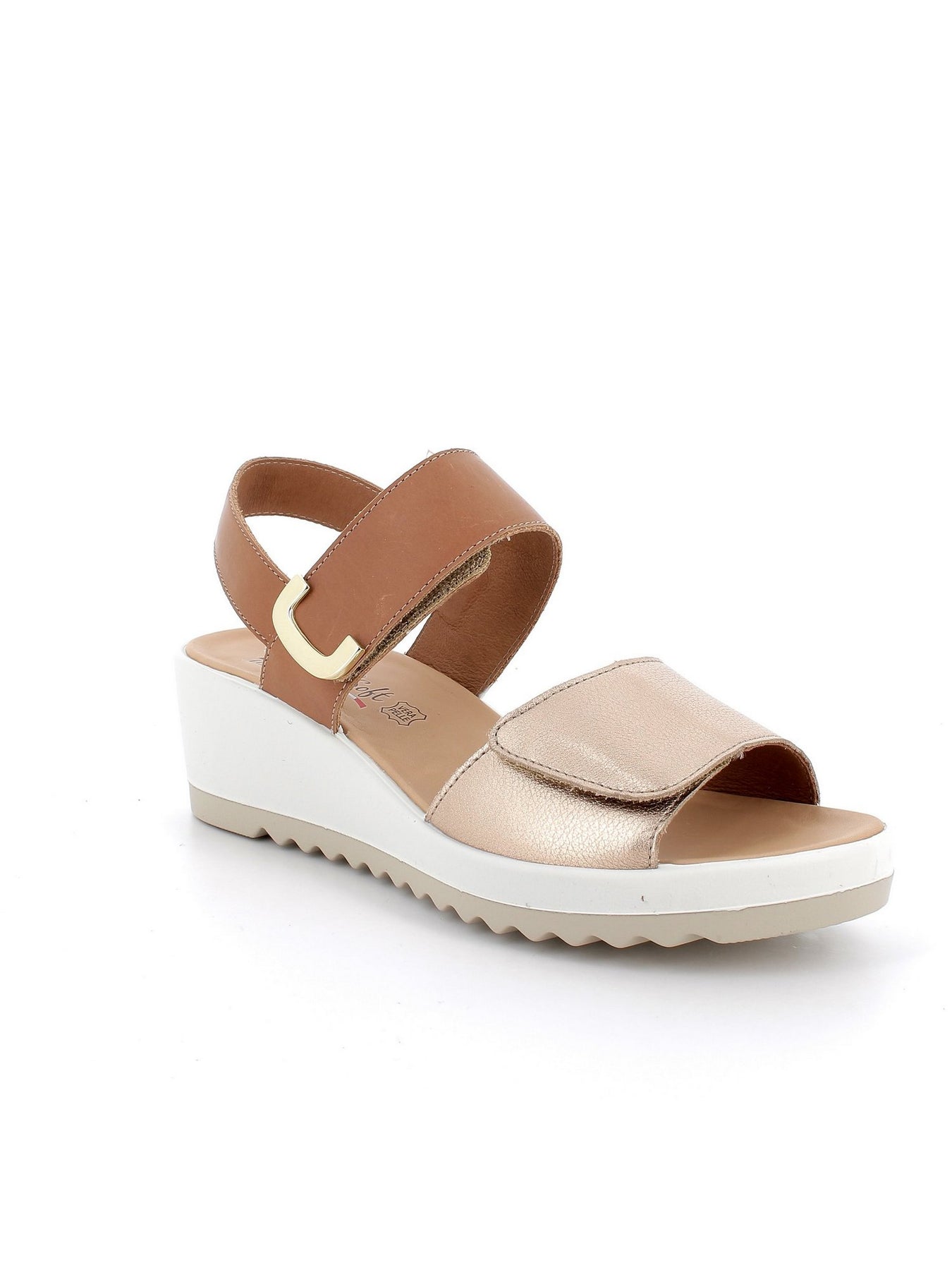 Il ENVAL SOFT Sandalo Con Zeppa Donna modello 77788 in Champagne/Beige unisce un design essenziale a un tocco di luminosità sobria e raffinata, perfetto per la stagione estiva.