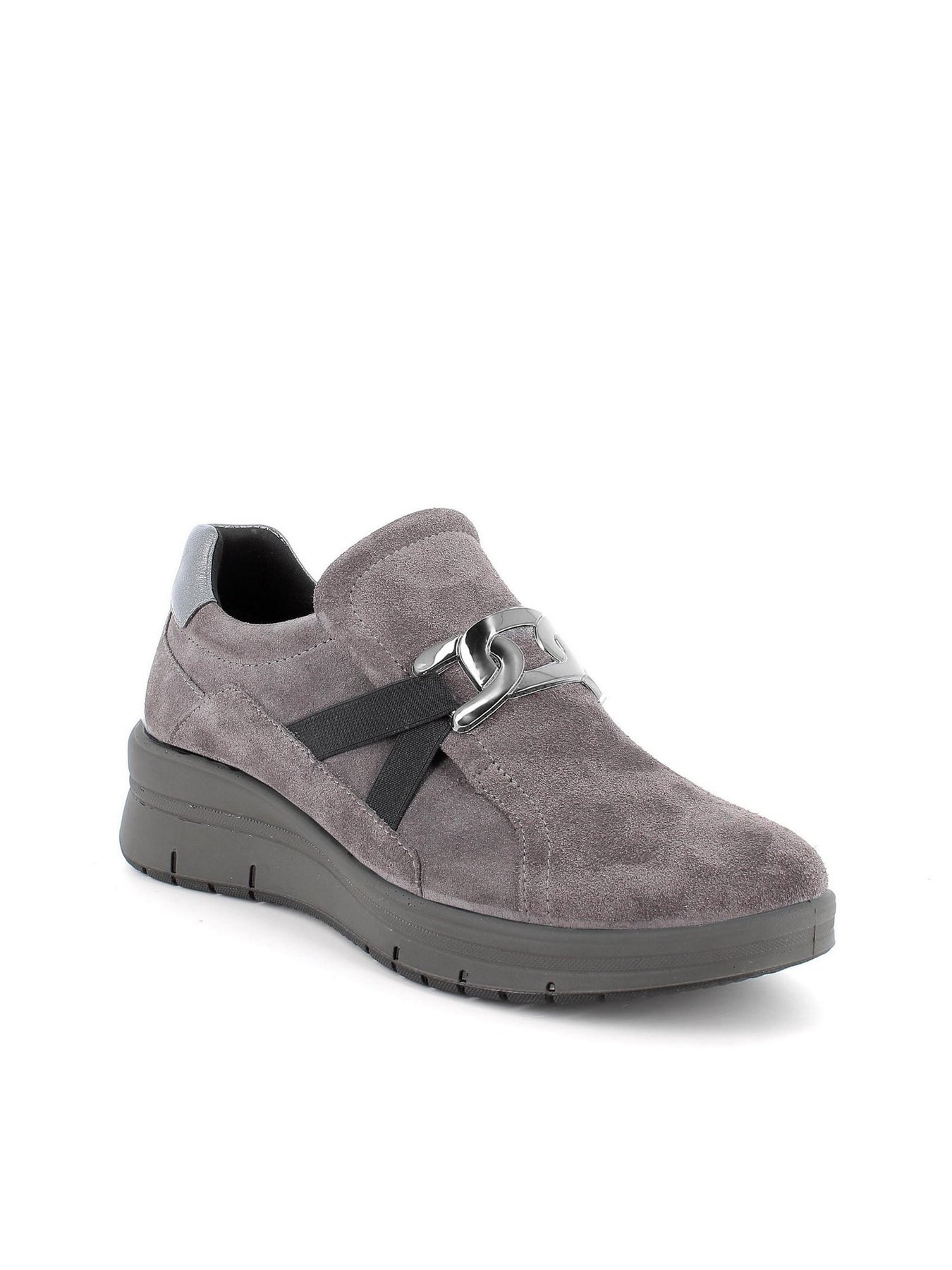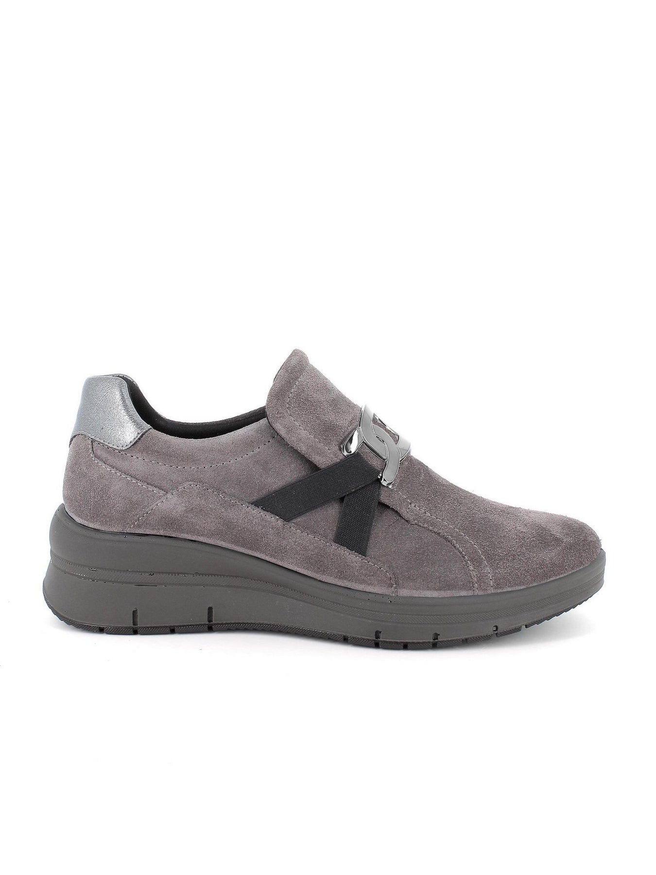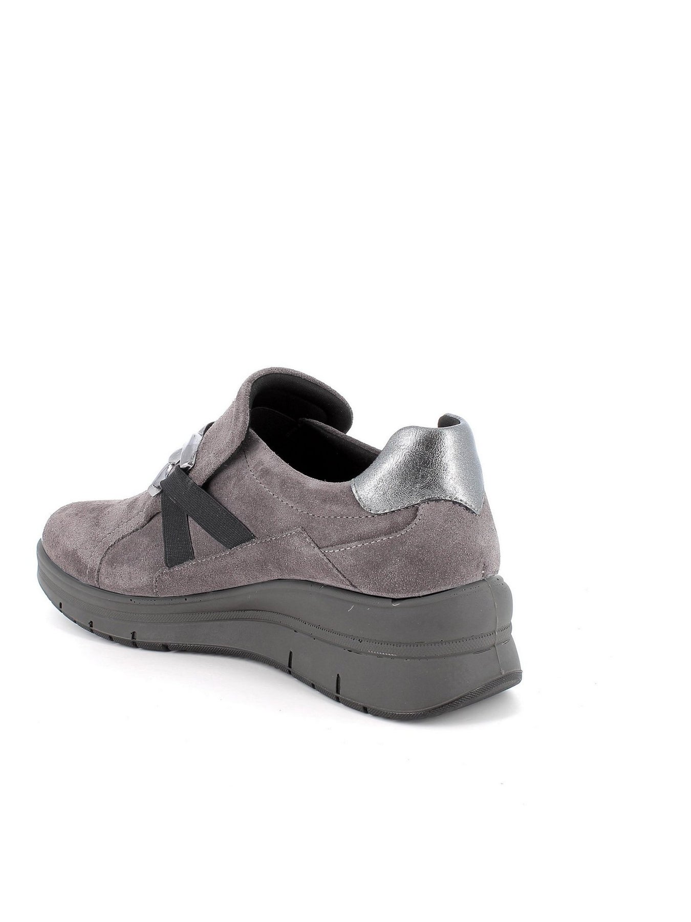 La sneaker ENVAL SOFT 87780 Grigio Scuro è una calzatura comoda e raffinata, ideale per l'uso quotidiano. La tomaia in pelle scamosciata grigio scuro con dettaglio metallizzato sul tallone e fascia elastica frontale offre eleganza e praticità.