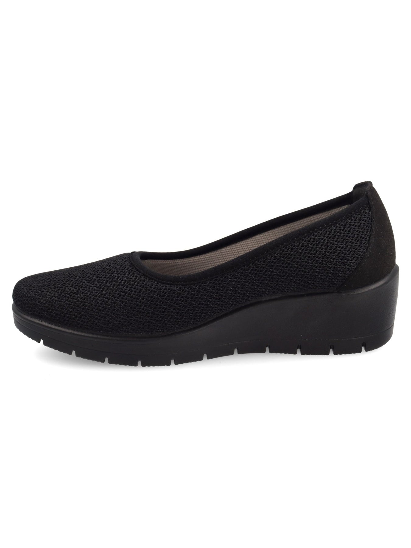 La tomaia in tessuto tecnico nero con finitura traspirante avvolge il piede con delicatezza, mentre la zeppa leggera dona slancio alla figura senza rinunciare alla stabilità. Il sottopiede anatomico favorisce una postura corretta e comfort continuo, ideale per un uso quotidiano sia in ambienti lavorativi che nel tempo libero.