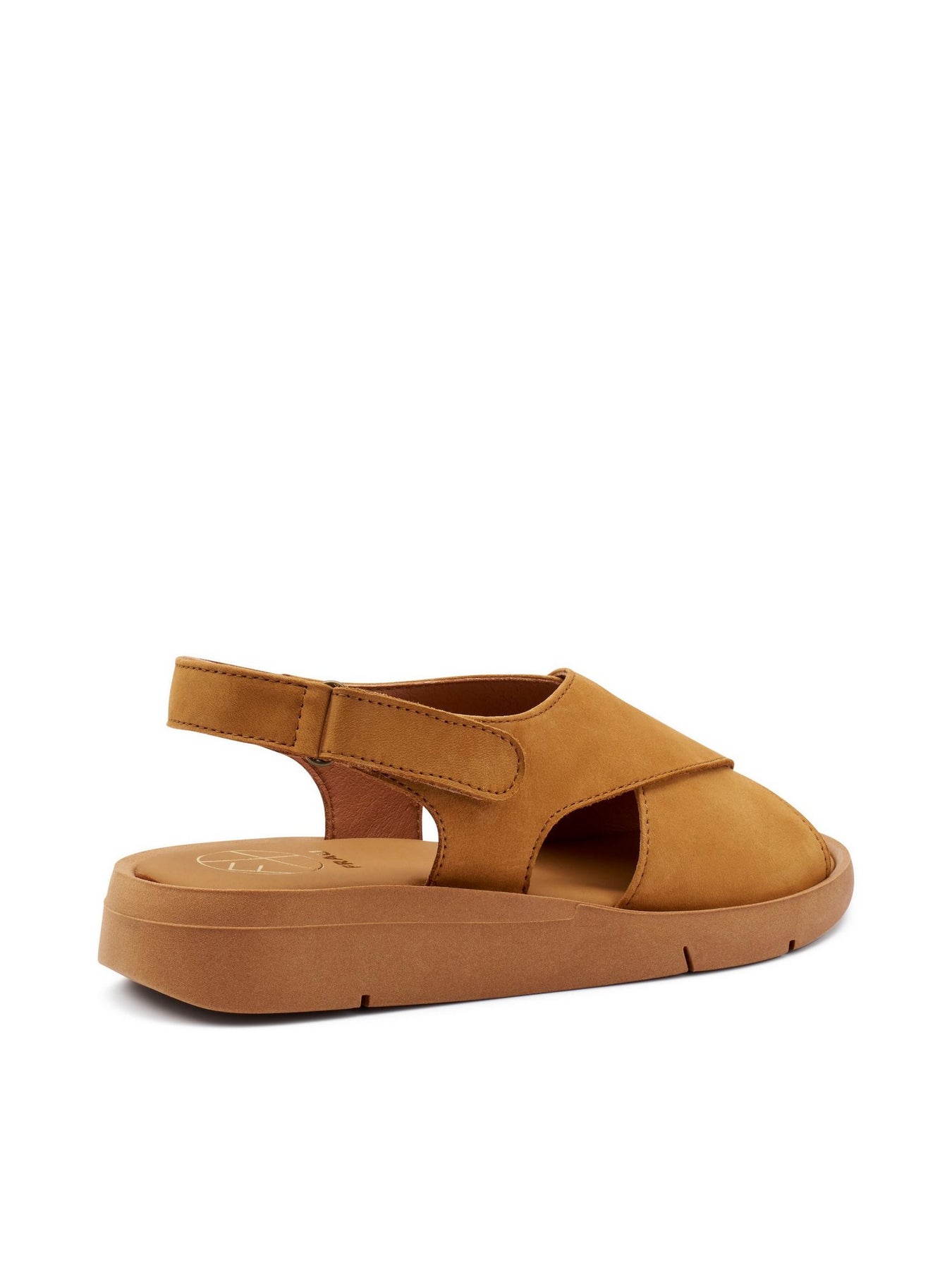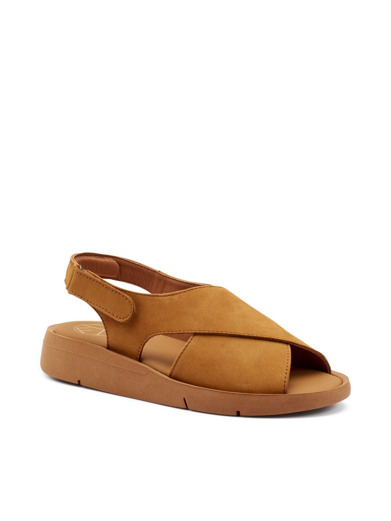 Realizzato in morbida pelle scamosciata, questo sandalo si distingue per la sua linea avvolgente con fascette incrociate e una silhouette essenziale. La tonalità caramel è calda e versatile, perfetta da abbinare a jeans, abiti estivi o pantaloni in lino.