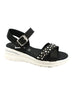 Eleganza urbana e comodità quotidiana si fondono nel sandalo con zeppa KEYS K-11110 in versione nero. Il design minimal è impreziosito da una fascia anteriore decorata con borchie e strass tono su tono, che donano luminosità e un tocco glamour senza rinunciare alla sobrietà del colore.
