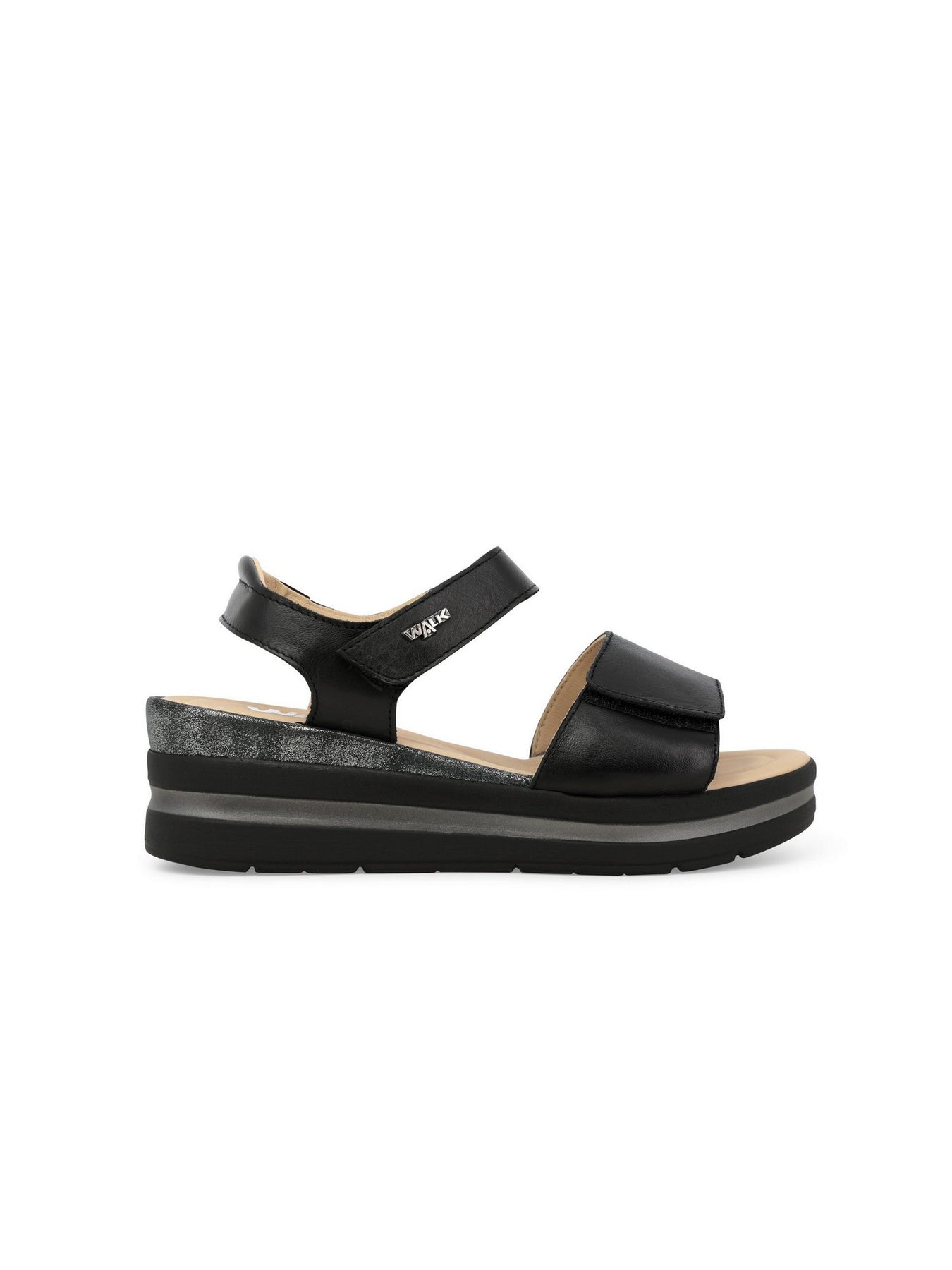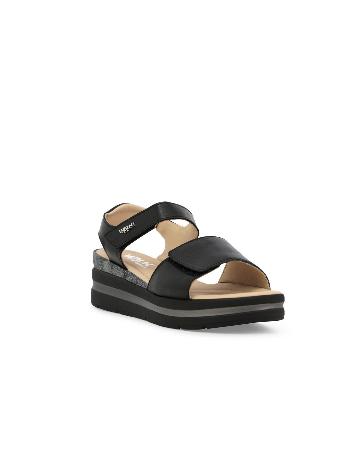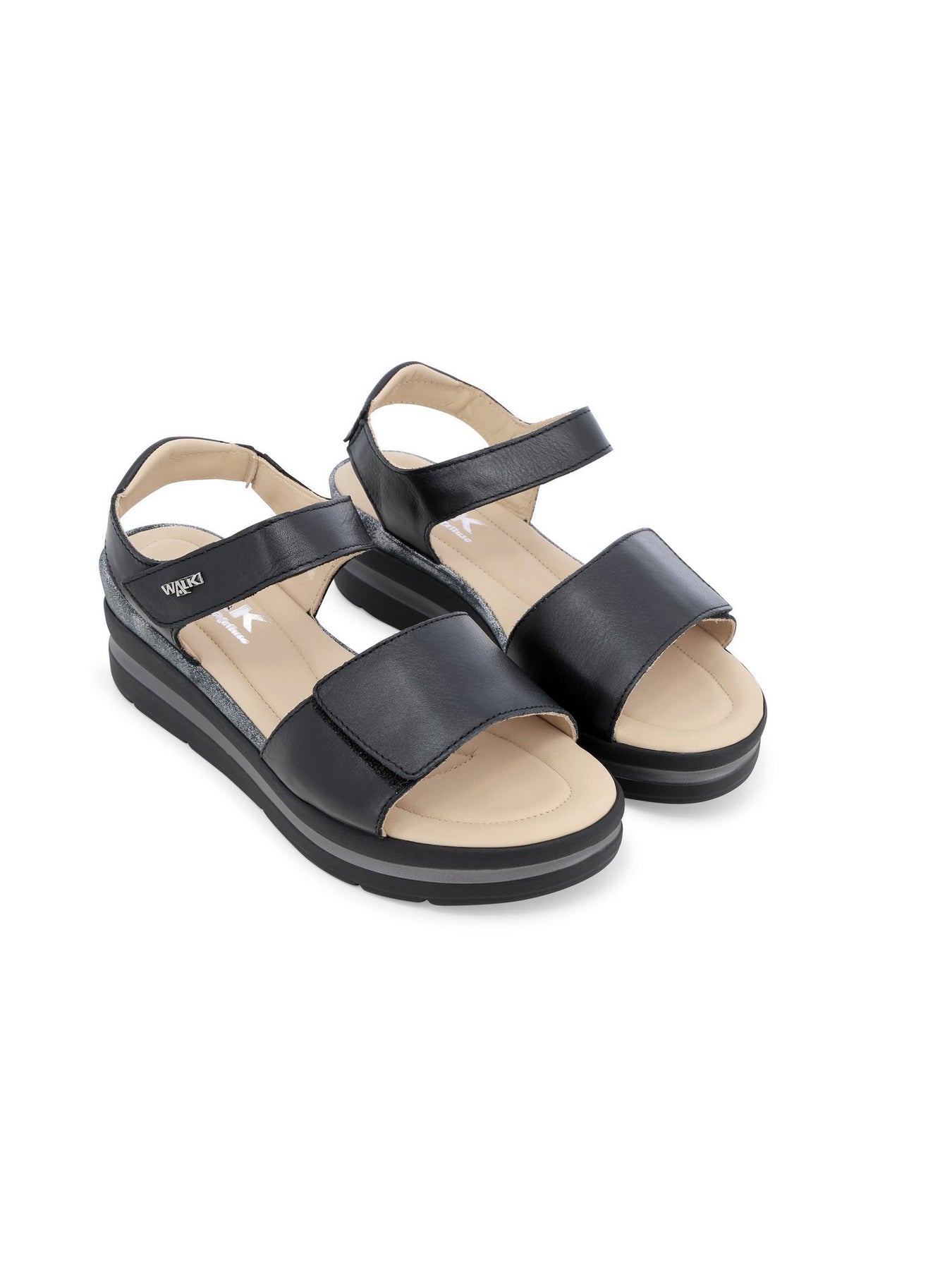 La tomaia in vera pelle con strappi in velcro garantisce una calzata regolabile e stabile, mentre il plantare in memory foam assicura un appoggio soffice e duraturo. La zeppa monoblocco da 5 cm dona slancio senza rinunciare alla comodità.