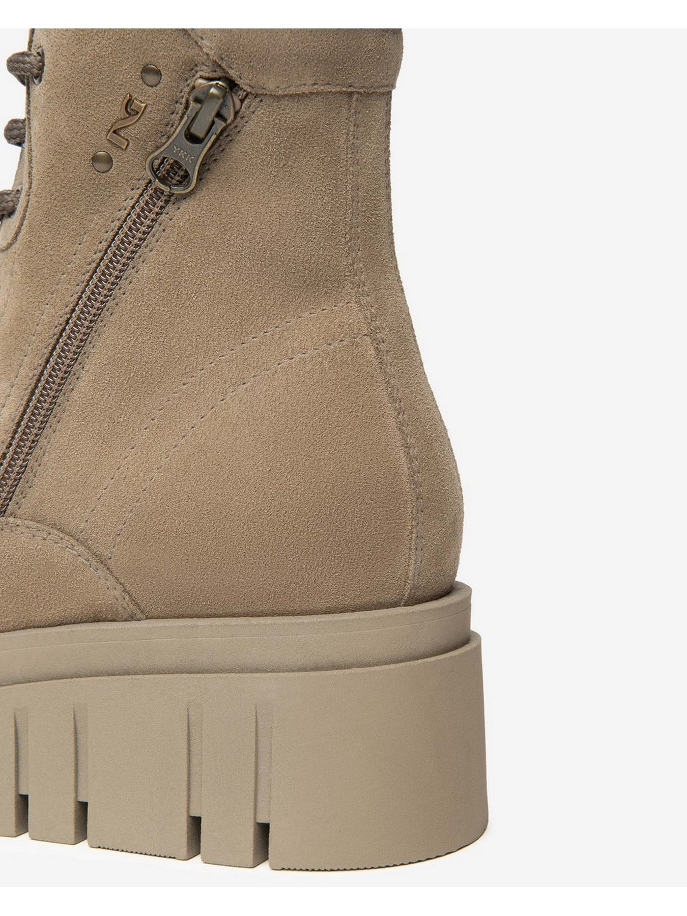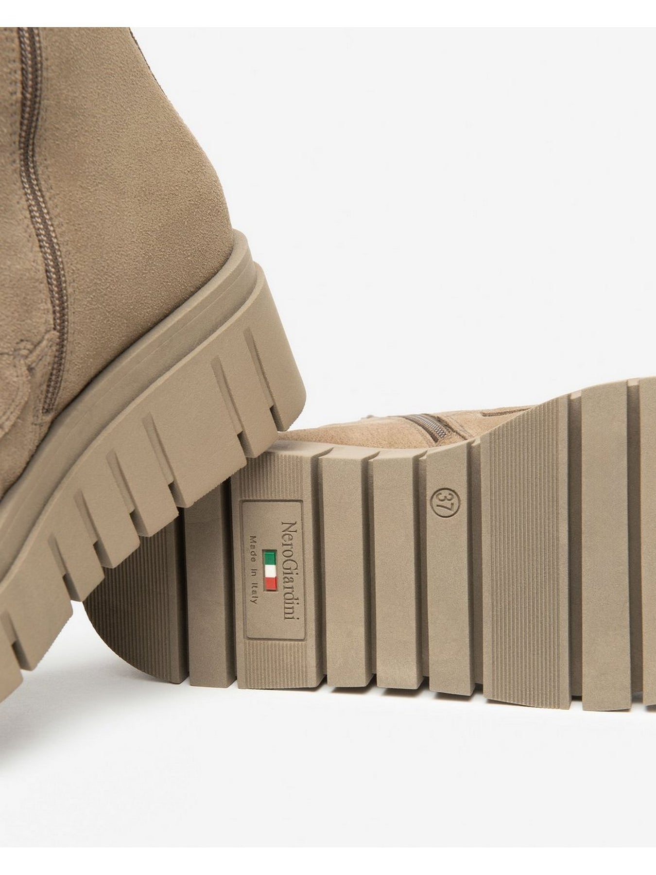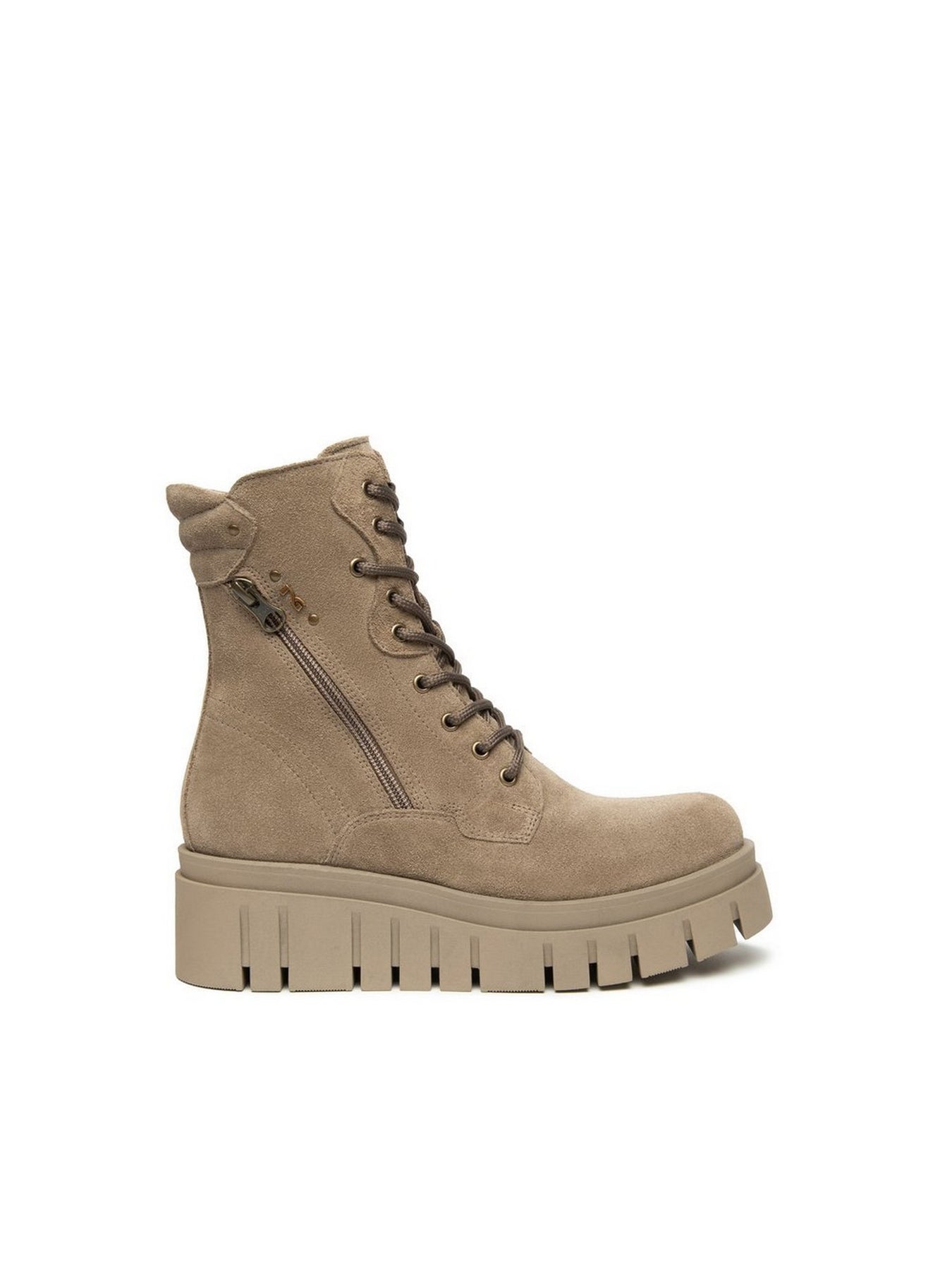 Realizzato in pelle scamosciata di alta qualità, si distingue per il colore talpa versatile e raffinato. La suola platform in gomma con tacco da 5,5 cm dona altezza, stabilità e un look moderno. La chiusura zip laterale rende la calzata pratica e veloce, mantenendo un design lineare e funzionale.