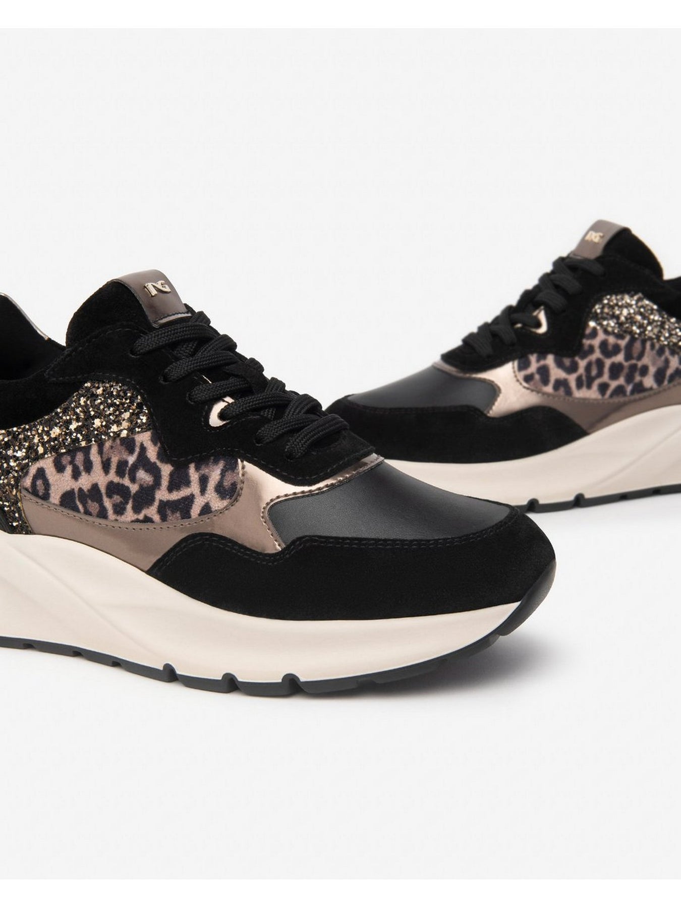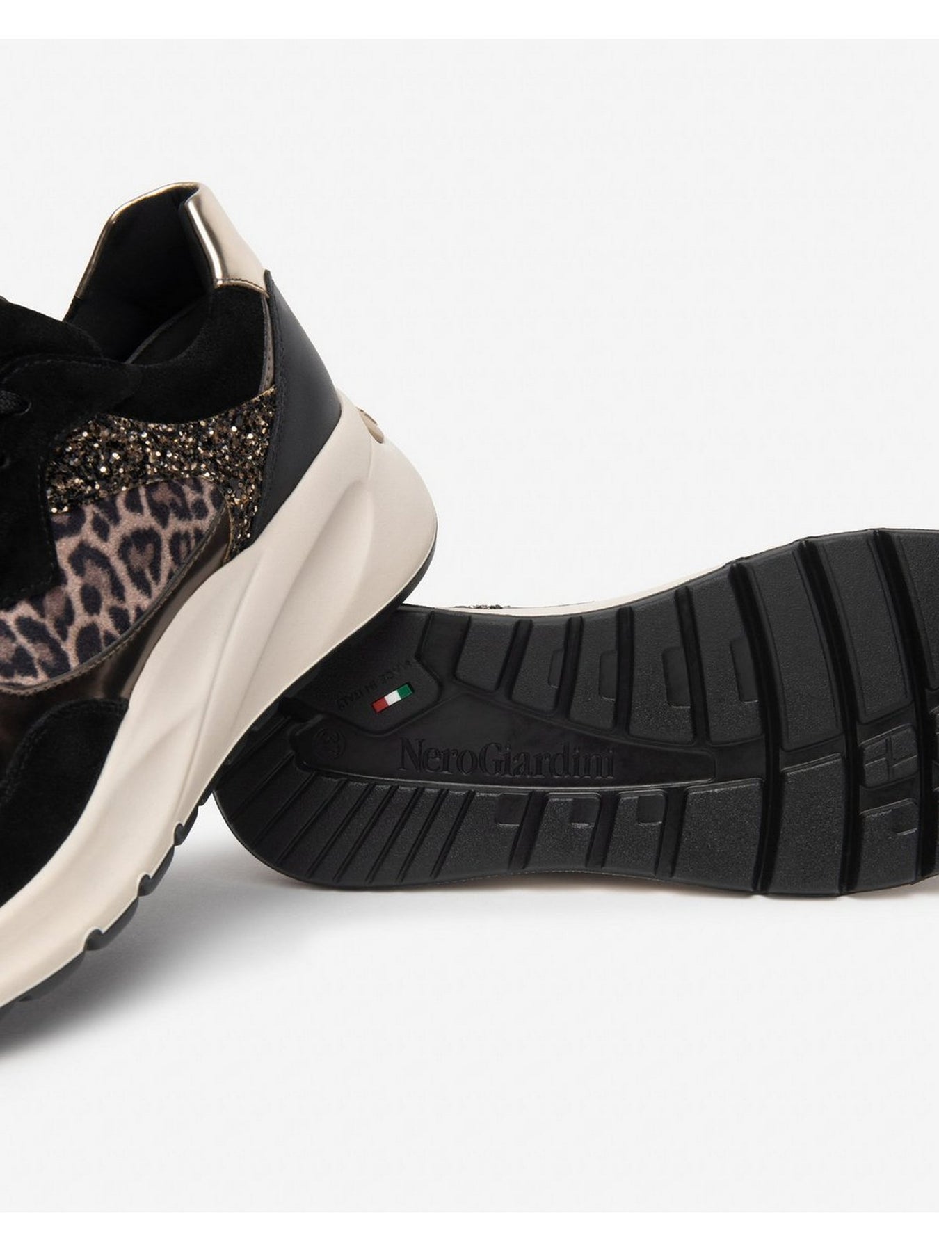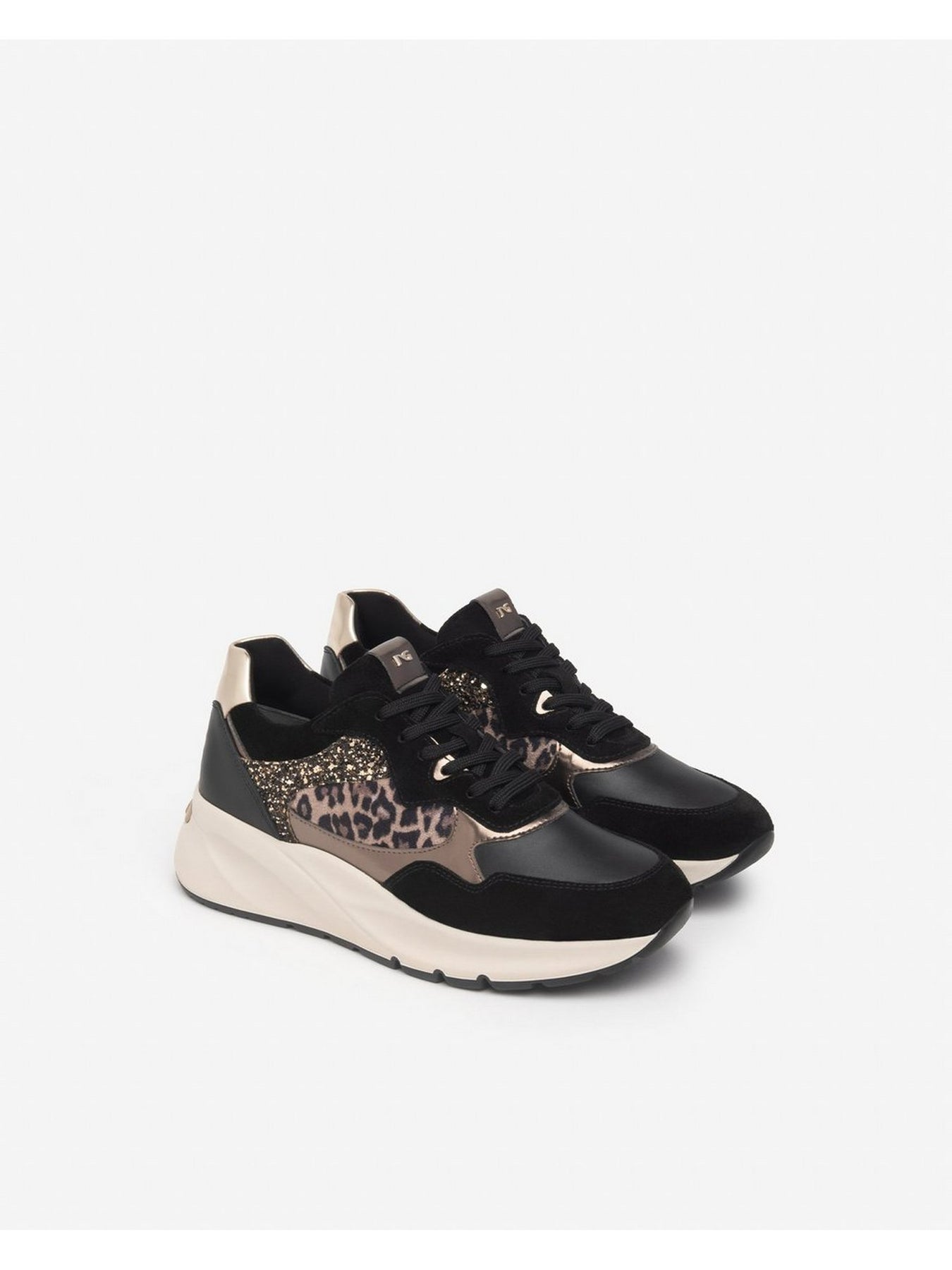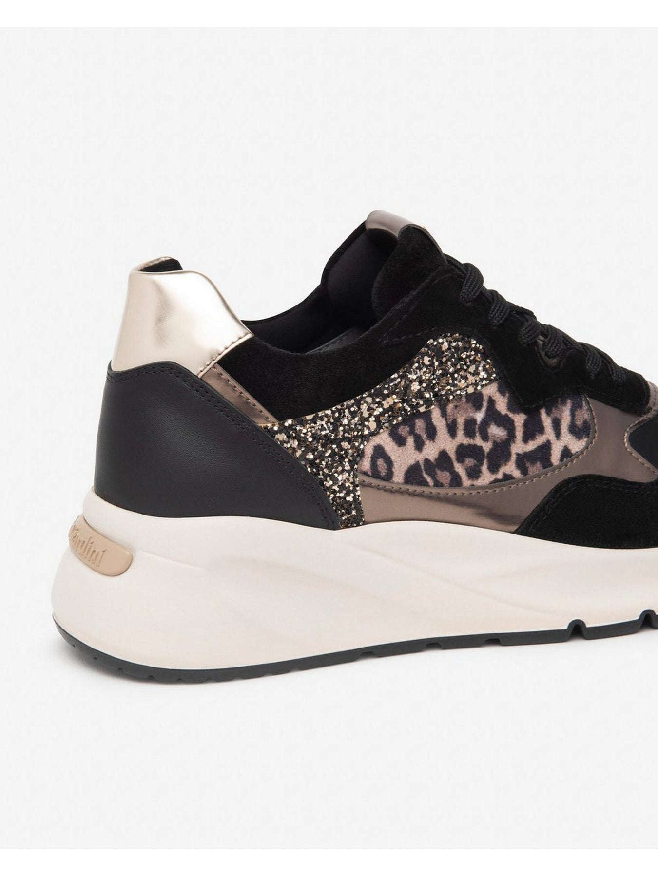 Questa sneaker è realizzata in pelle e materiale tecnico, con fodera interna in pelle e tessuto che assicura traspirabilità e comfort. Il design mixa tonalità nere con dettagli glitter e animalier, regalando un look grintoso e femminile.