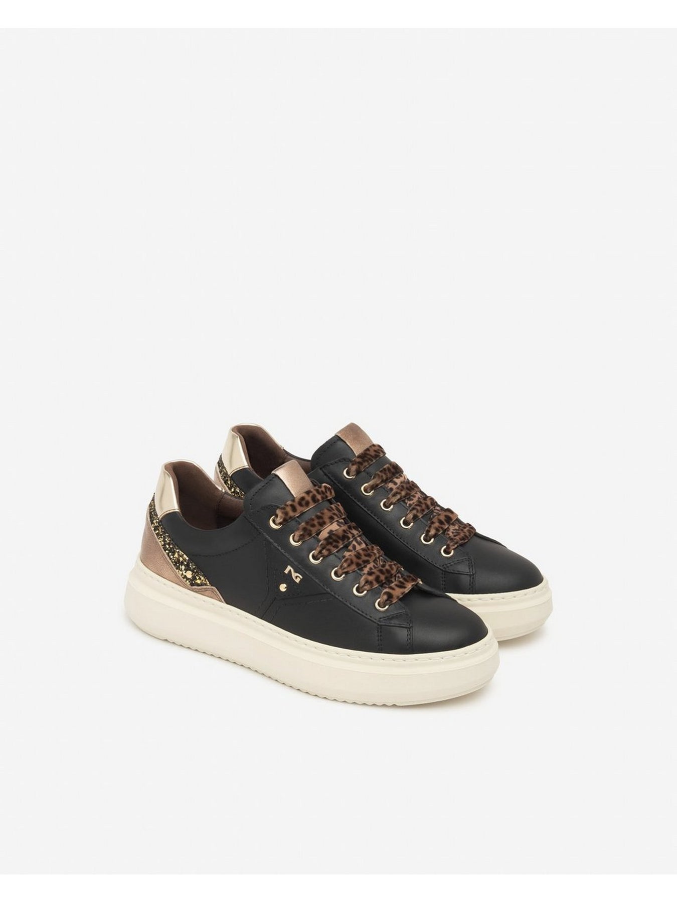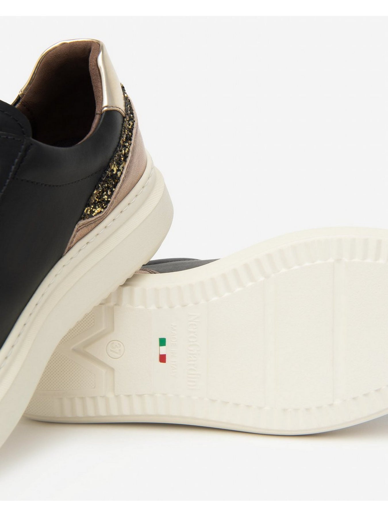 Realizzata in pelle di alta qualità, presenta un design contemporaneo impreziosito da inserti beige a contrasto e dettagli glitterati sul retro, che donano luminosità e carattere. La suola platform bianca, leggera e resistente, regala slancio alla silhouette e assicura comodità per tutta la giornata.