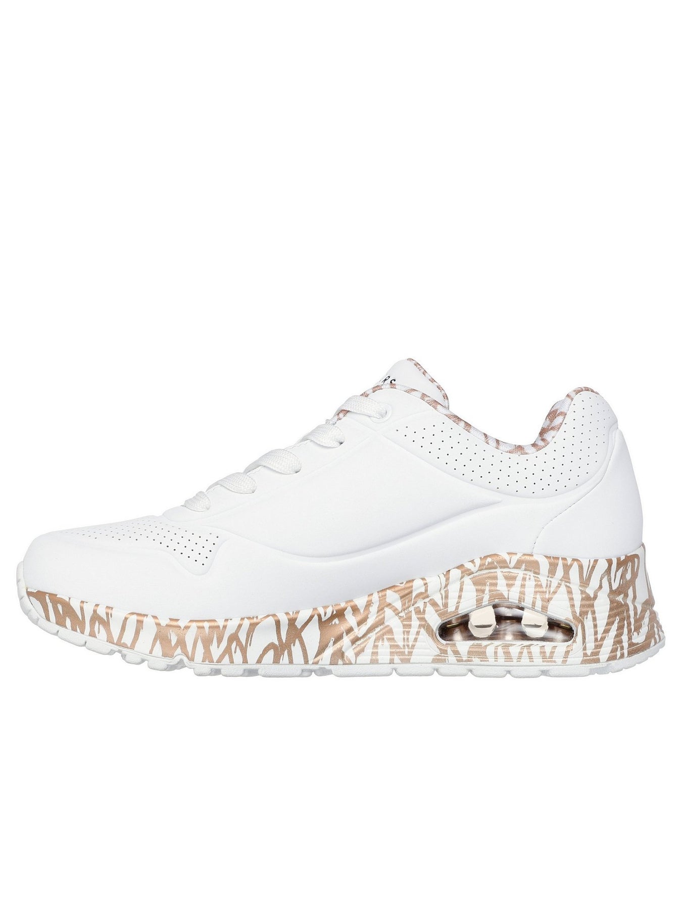 La sneaker SKECHERS Uno 155506 Bianco unisce design fashion e comfort sportivo. Realizzata in similpelle bianca, è arricchita da dettagli oro e da una suola platform con decorazioni a contrasto che donano un look trendy e distintivo.