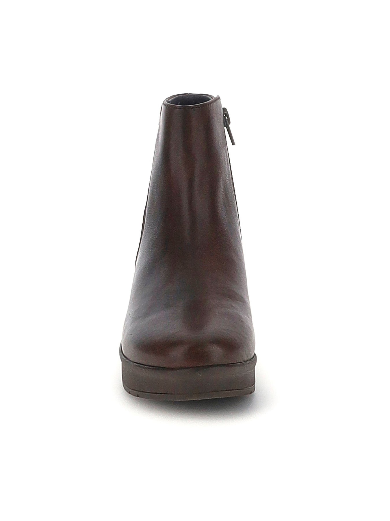 Realizzato in pelle marrone cioccolato con inserti elastici laterali decorati e finitura leggermente sfumata, presenta una zip laterale che ne facilita la calzata.