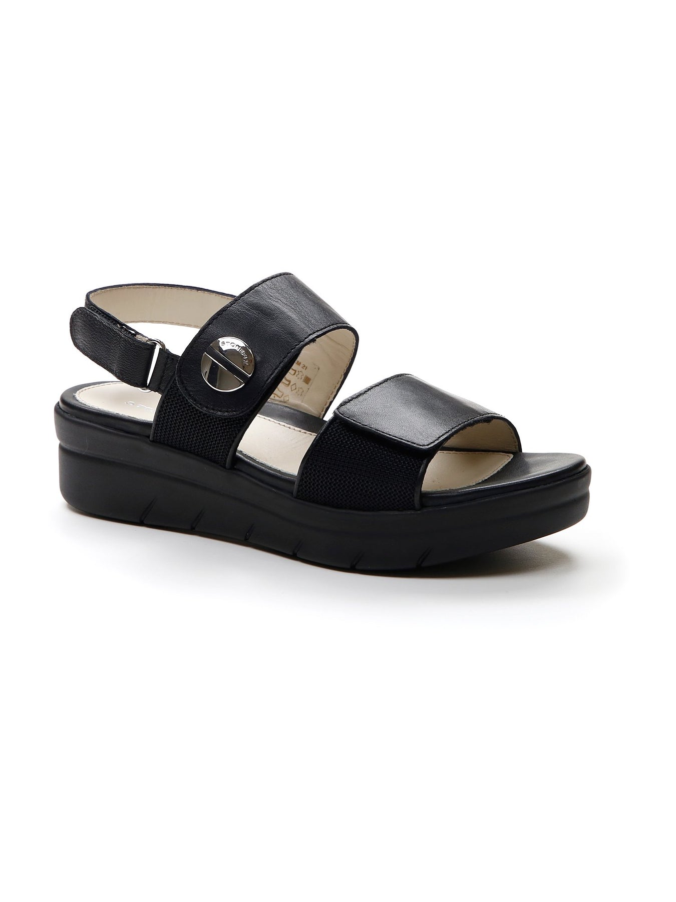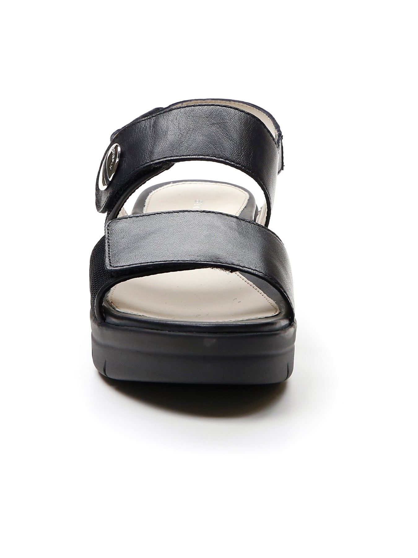 La tomaia in pelle nappa combinata con inserti in tessuto elasticizzato garantisce una calzata comoda e flessibile. Il cinturino posteriore con chiusura a velcro facilita la calzatura e assicura stabilità al piede. La zeppa con tecnologia Blusoft® ammortizza ogni passo, rendendo questo modello ideale per l'uso quotidiano.