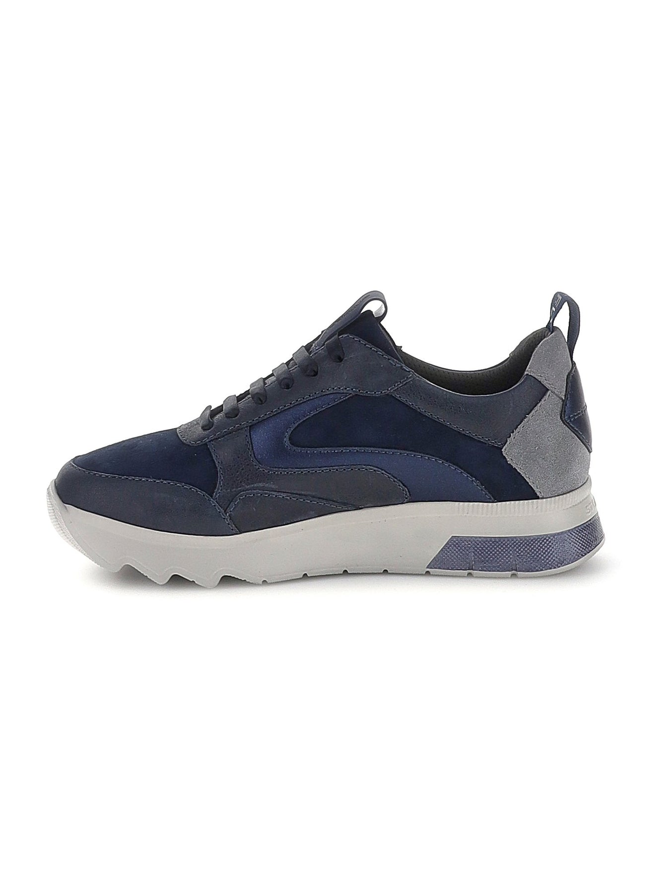 Il design moderno unisce inserti in tonalità blu e grigio con una suola alta e leggera, che integra la tecnologia Blusoft® per garantire ammortizzazione e benessere a ogni passo. La zeppa interna offre un effetto slanciato senza rinunciare alla comodità.