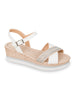 Questo sandalo con zeppa firmato VALLEVERDE è un perfetto equilibrio tra eleganza e praticità. La tomaia in eco-pelle bianca è arricchita da inserti decorativi con strass argentati sulle fasce incrociate anteriori, ideali per dare un tocco luminoso e femminile ai tuoi look estivi.