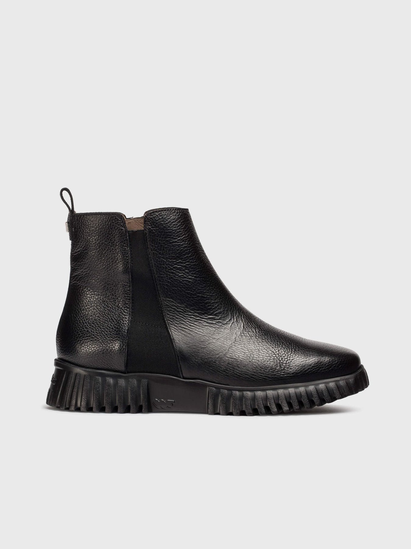 Realizzato in pelle nera con finitura liscia, presenta gli iconici elastici laterali in stile Chelsea che garantiscono praticità e una calzata rapida. La suola dentellata in gomma con zeppa leggera assicura stabilità, comfort e un tocco contemporaneo.