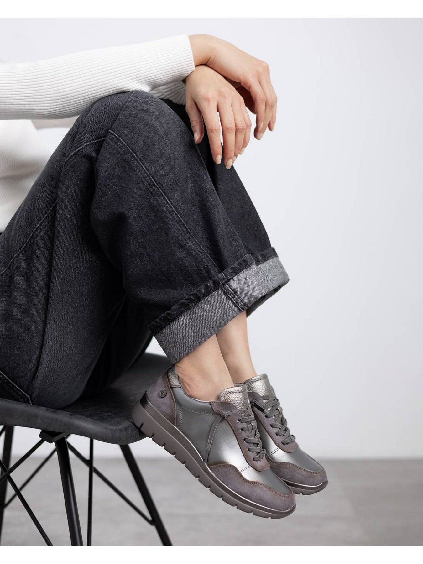 La suola leggera e flessibile assicura massimo comfort per l'uso quotidiano, rendendola perfetta per outfit casual e sporty chic. La tonalità argento, elegante e contemporanea, aggiunge un tocco brillante e sofisticato al look.