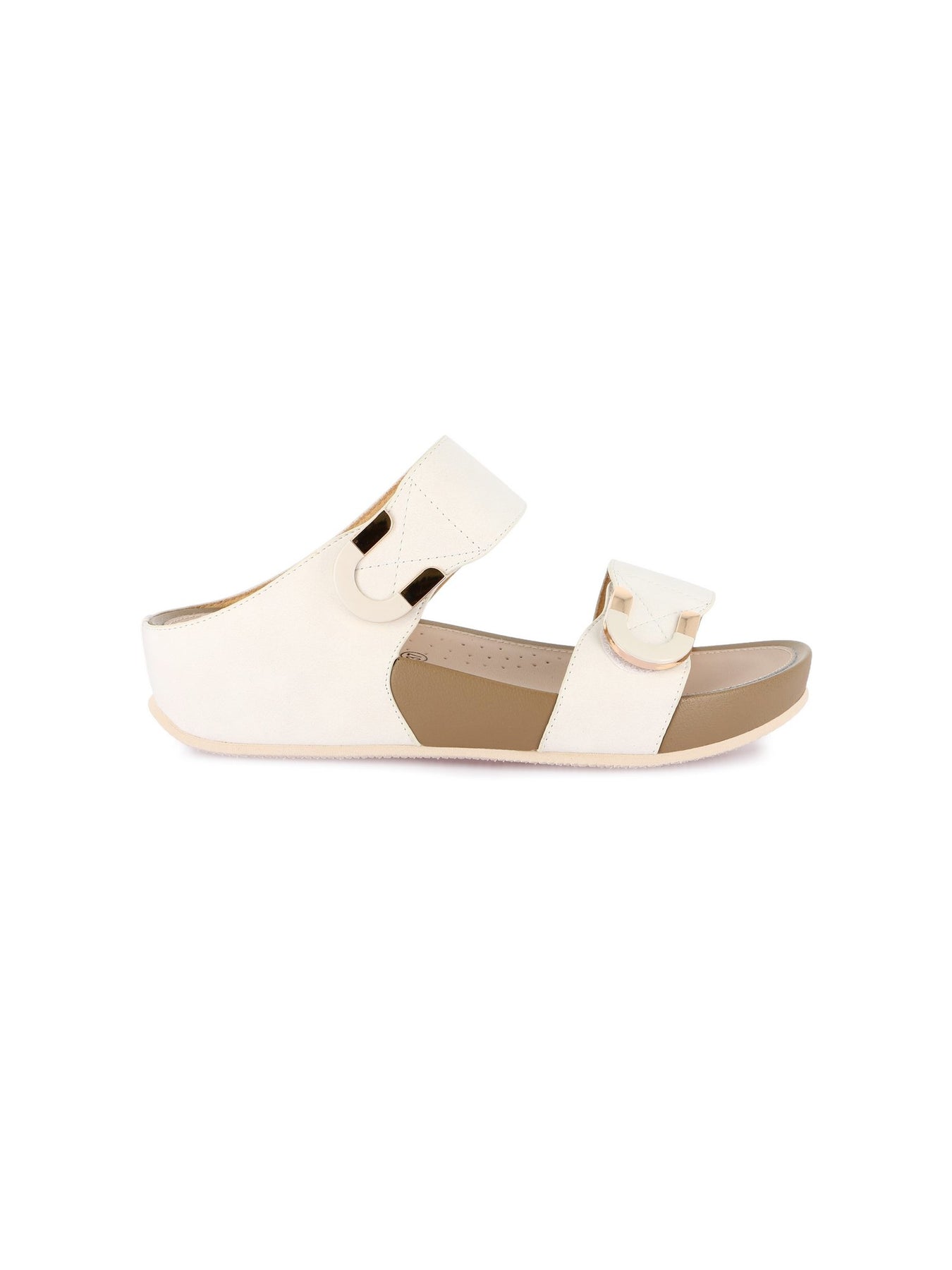 Tomaia Esterna: realizzata in materiale sintetico effetto pelle nella tonalità bianco con doppia fascia e dettagli metallici decorativi, progettata per offrire resistenza e uno stile elegante