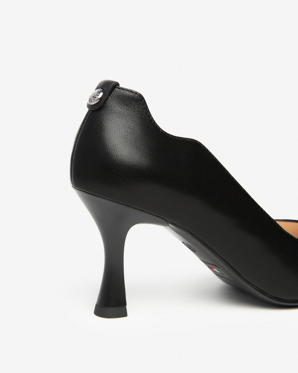 Realizzata in pelle nera liscia di alta qualità, presenta una punta affusolata che slancia la silhouette e un tacco medio scultoreo di circa 7 cm, stabile e confortevole.