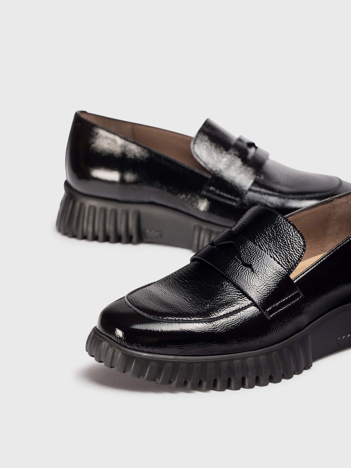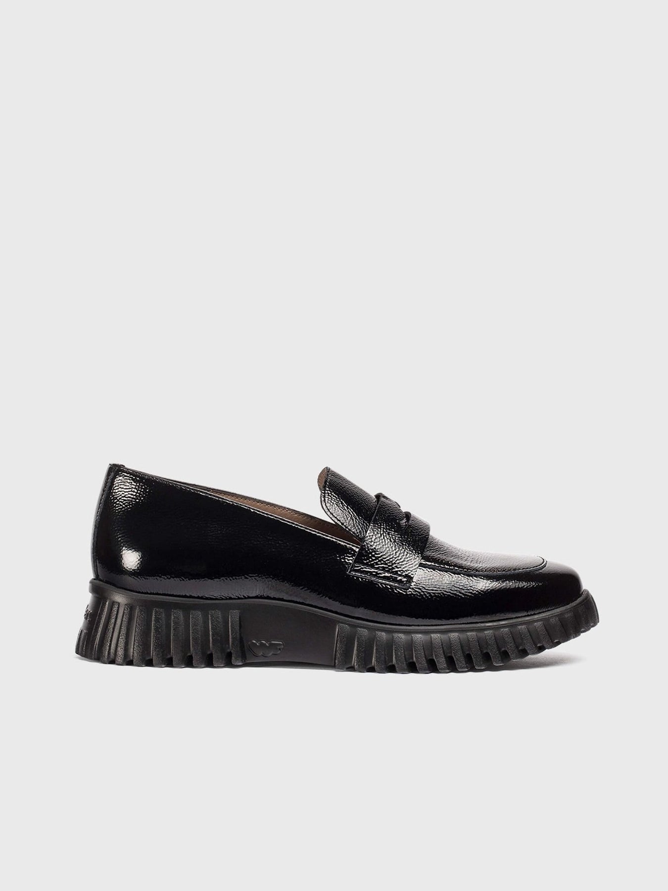 Realizzato in pelle verniciata nera, si distingue per il design essenziale e raffinato, arricchito dalla pratica zeppa che slancia la silhouette garantendo stabilità. La suola dentellata in gomma offre aderenza, leggerezza e resistenza, rendendolo adatto a un uso quotidiano.