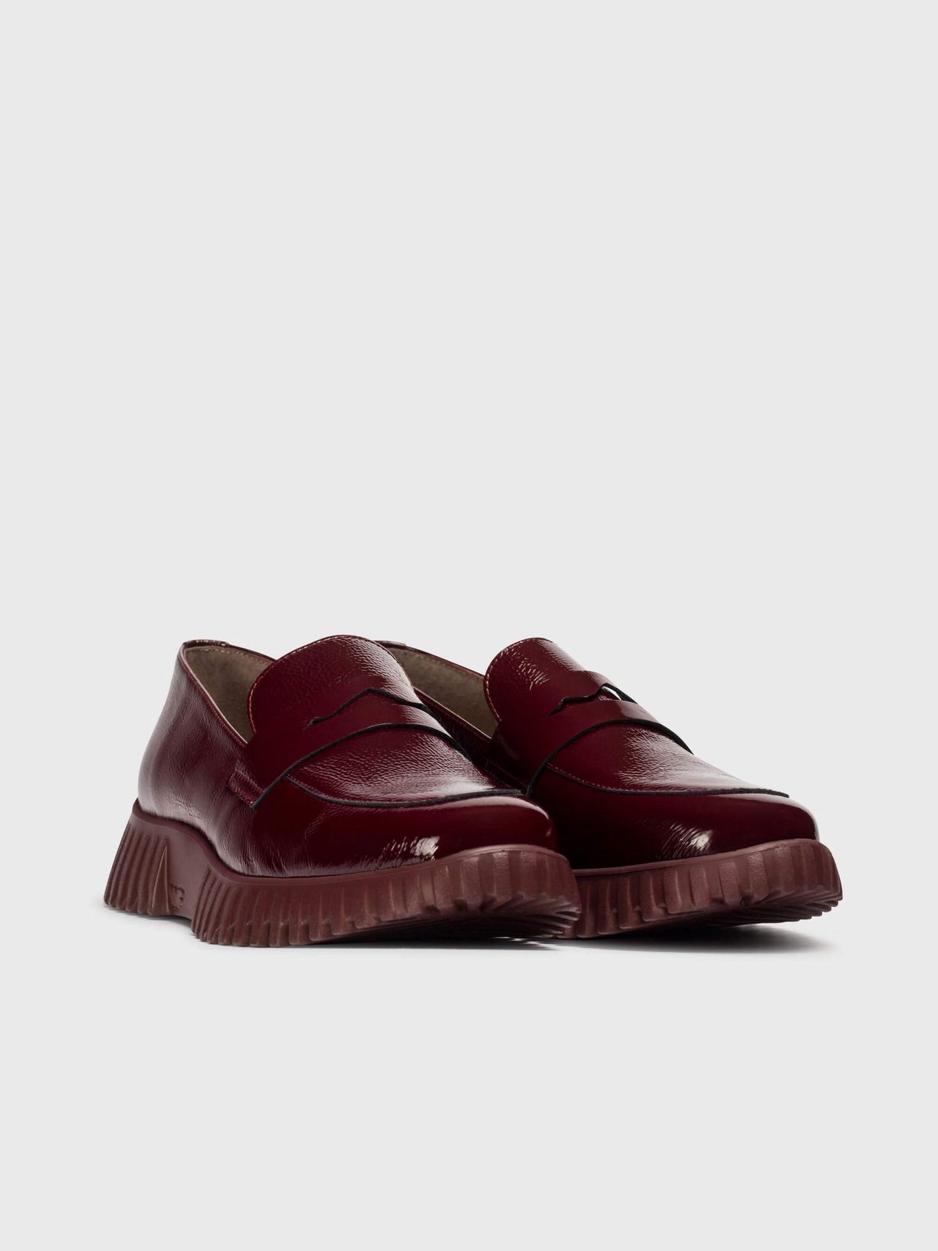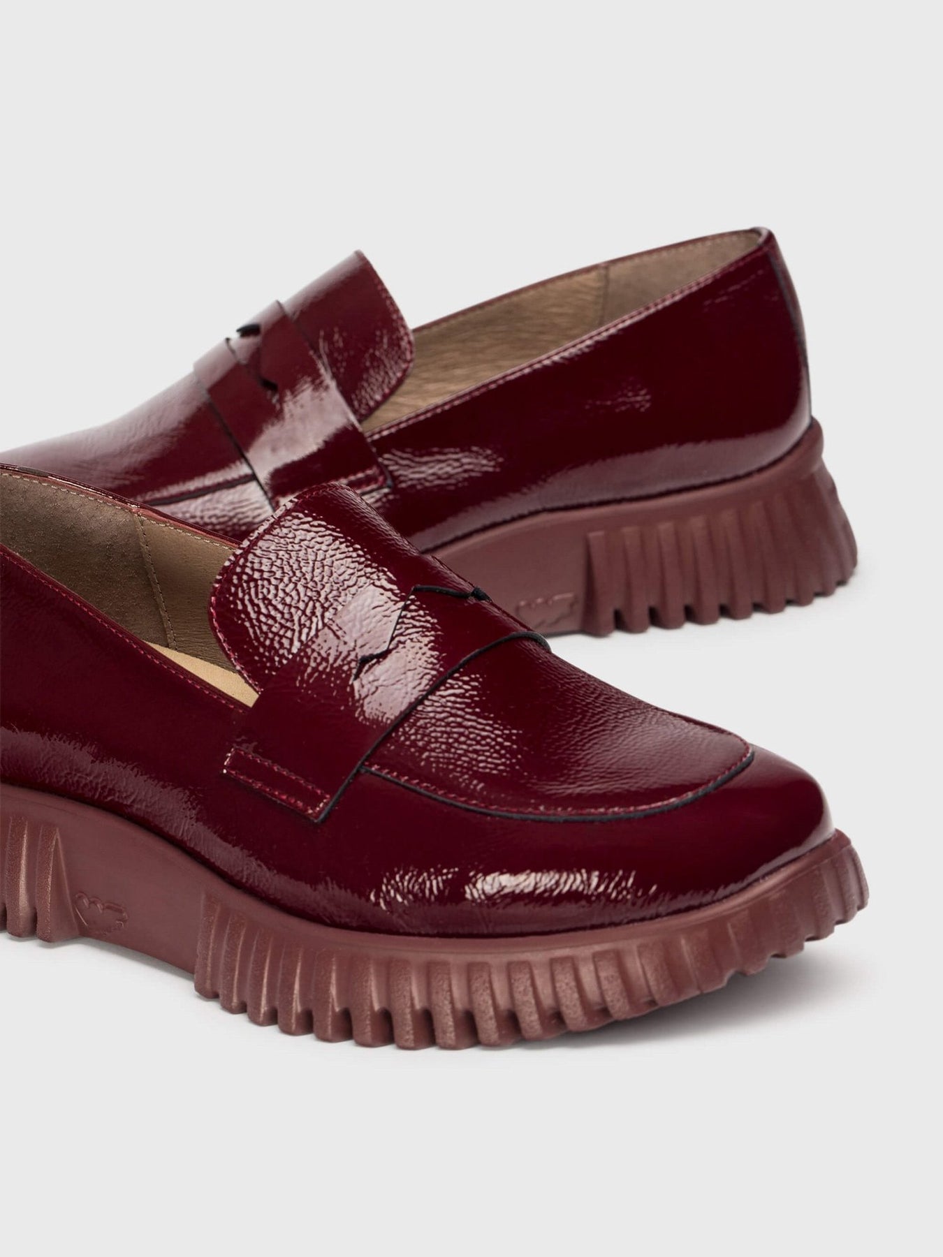 Realizzato in pelle verniciata bordeaux, abbina linee classiche a un tocco moderno, reso unico dalla zeppa leggera che dona altezza e stabilità. La suola dentellata in gomma assicura aderenza, flessibilità e resistenza, perfetta per un utilizzo quotidiano.