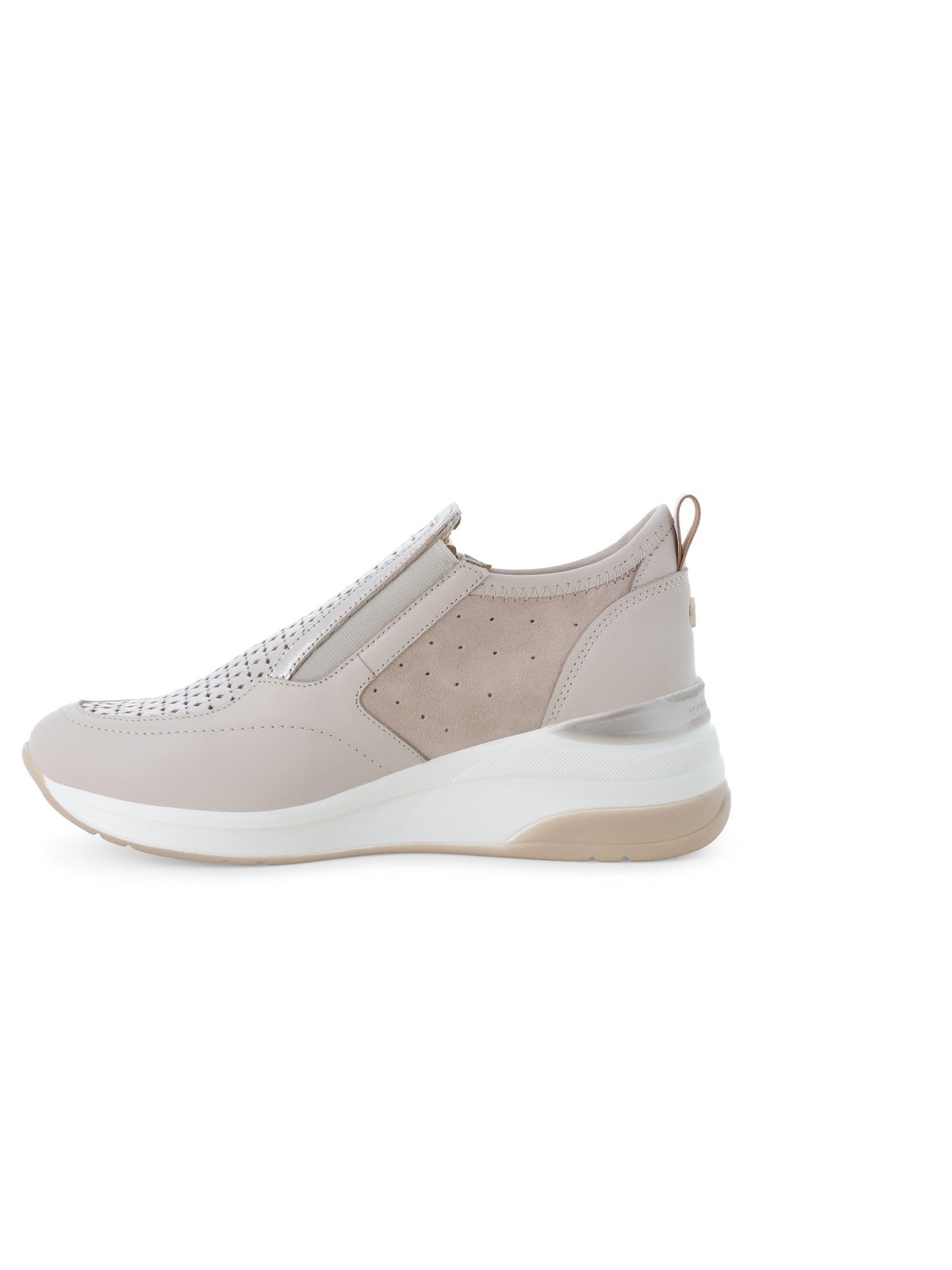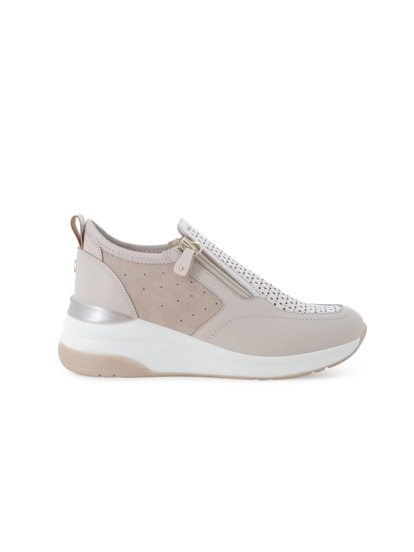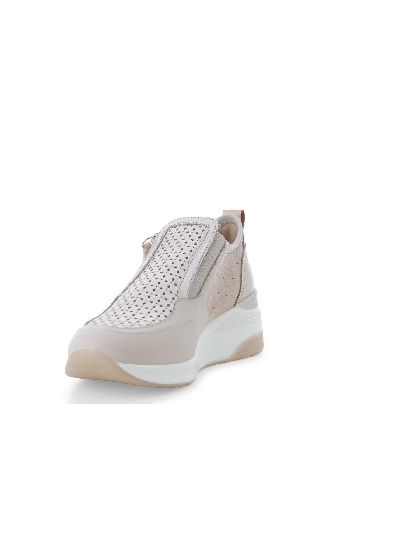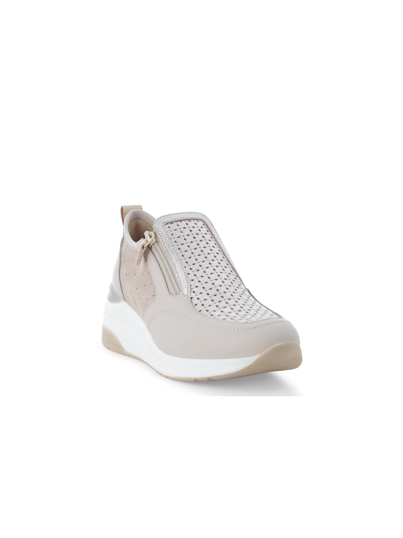 MELLUSO Sneaker Con Zeppa Donna - K56233 Bone sneaker donna dal design moderno e raffinato, perfetta per chi cerca comfort e stile in una calzatura versatile per l'uso quotidiano. La tonalità bone, neutra ed elegante, si abbina facilmente a diversi outfit, donando un look luminoso e contemporaneo ideale per la stagione primaverile ed estiva. Questa sneaker con zeppa donna MELLUSO si distingue per la tomaia traforata con inserti in pelle e camoscio e zip laterale, pensata per garantire traspirabilità, praticità e una calzata confortevole.