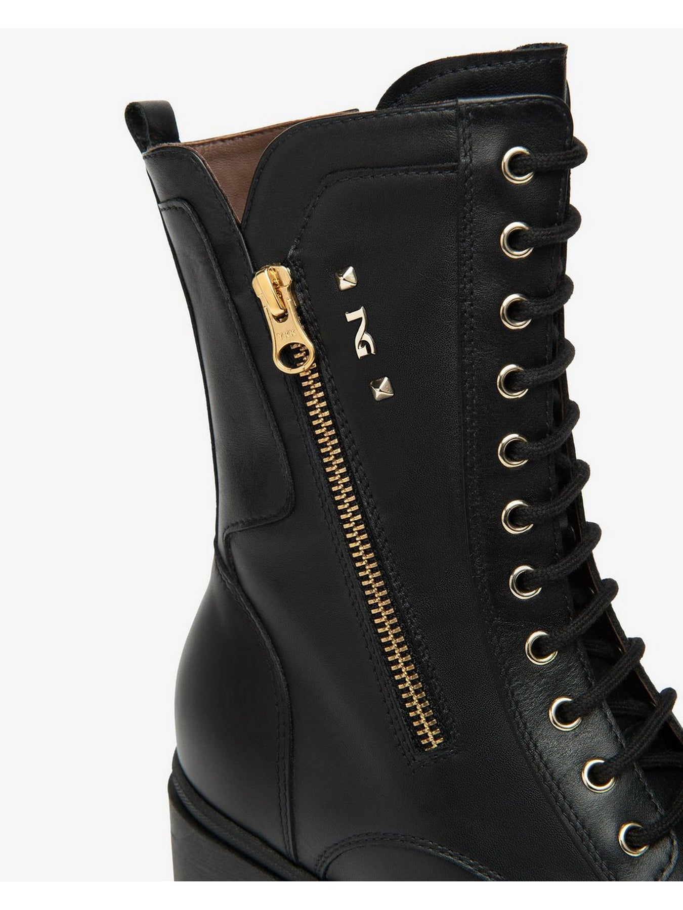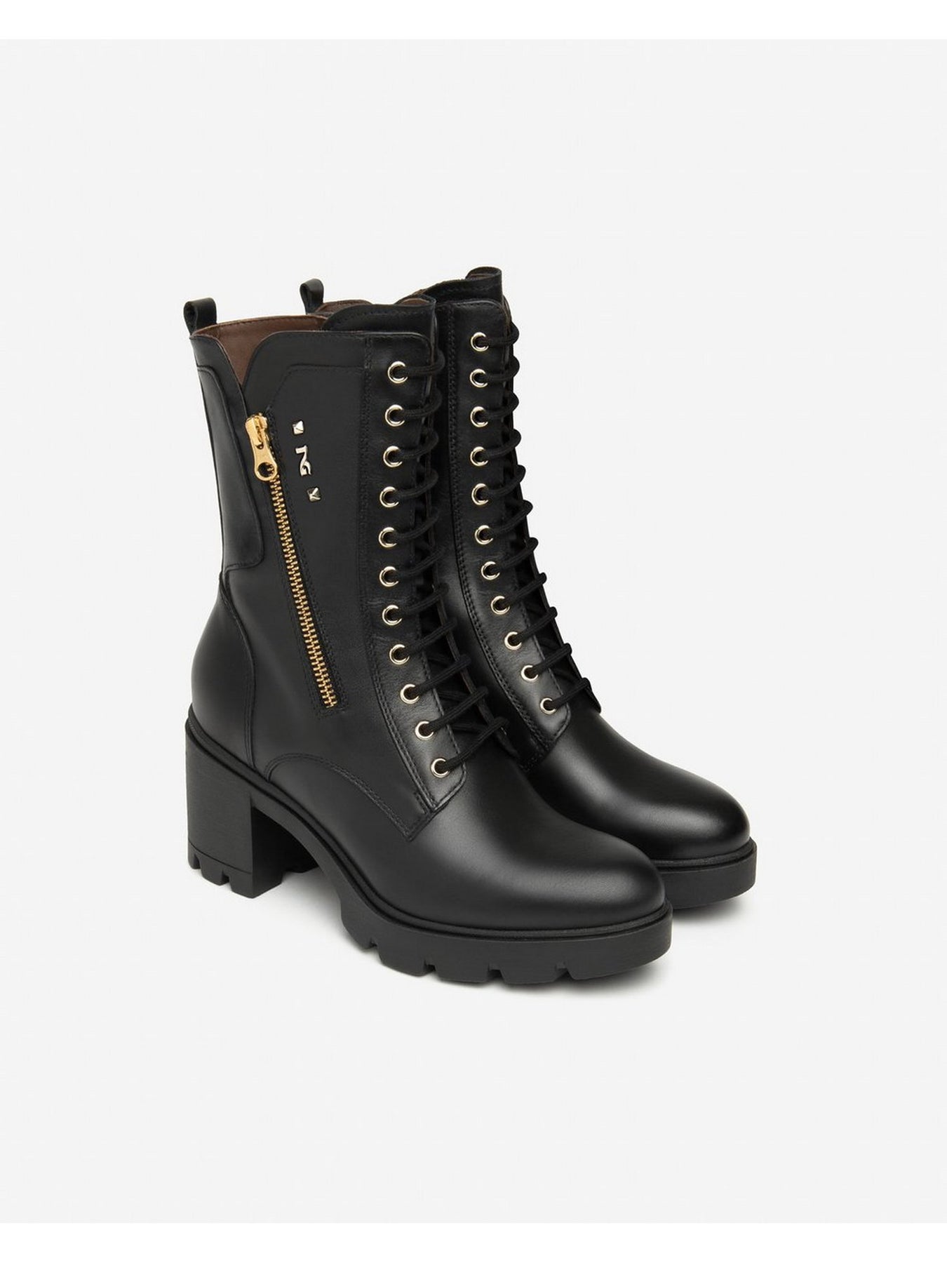 Realizzato in pelle nera di alta qualità, presenta lacci frontali e una zip laterale dorata che consente una calzata comoda e veloce, arricchendo il design con un dettaglio glamour.