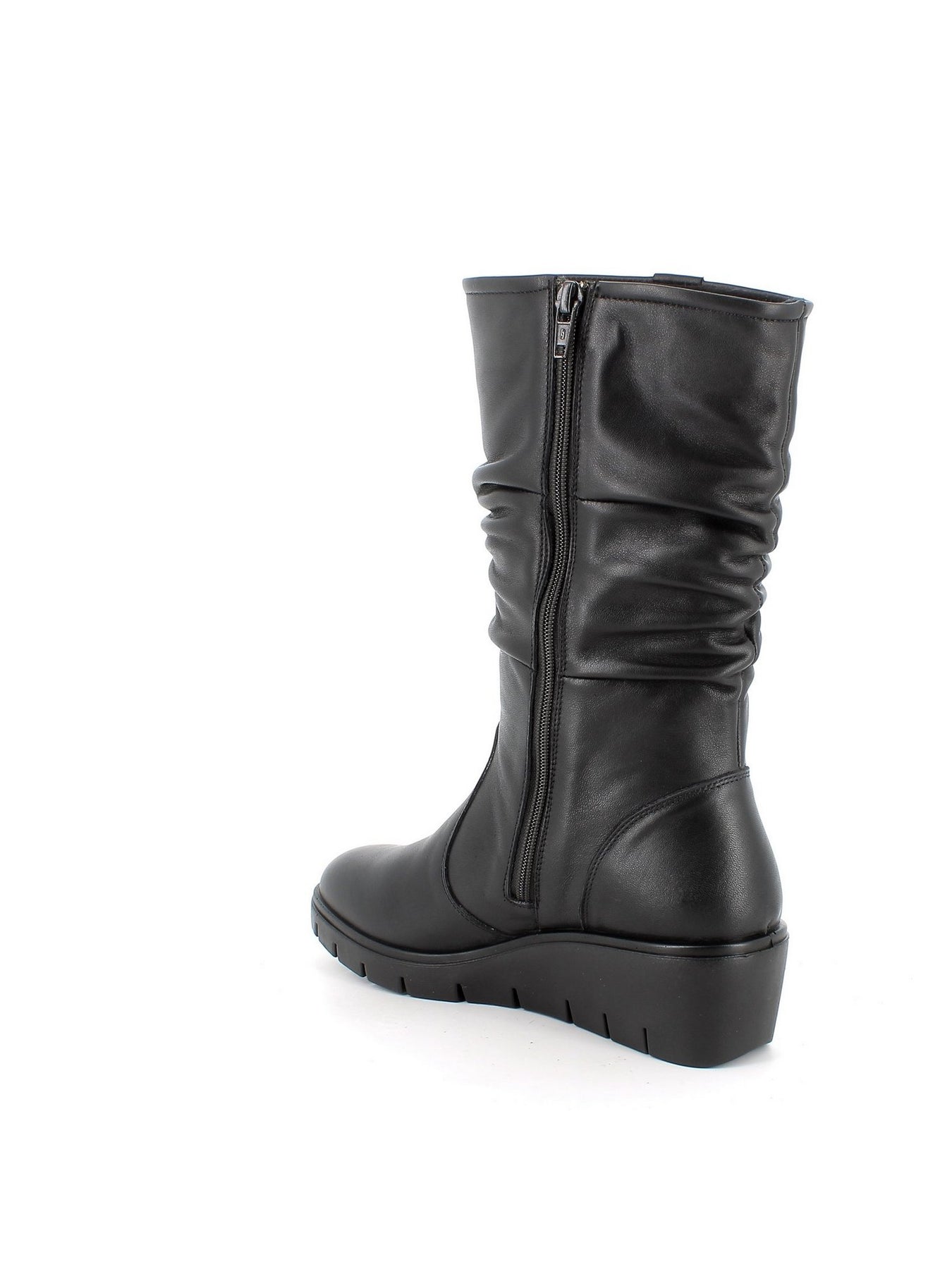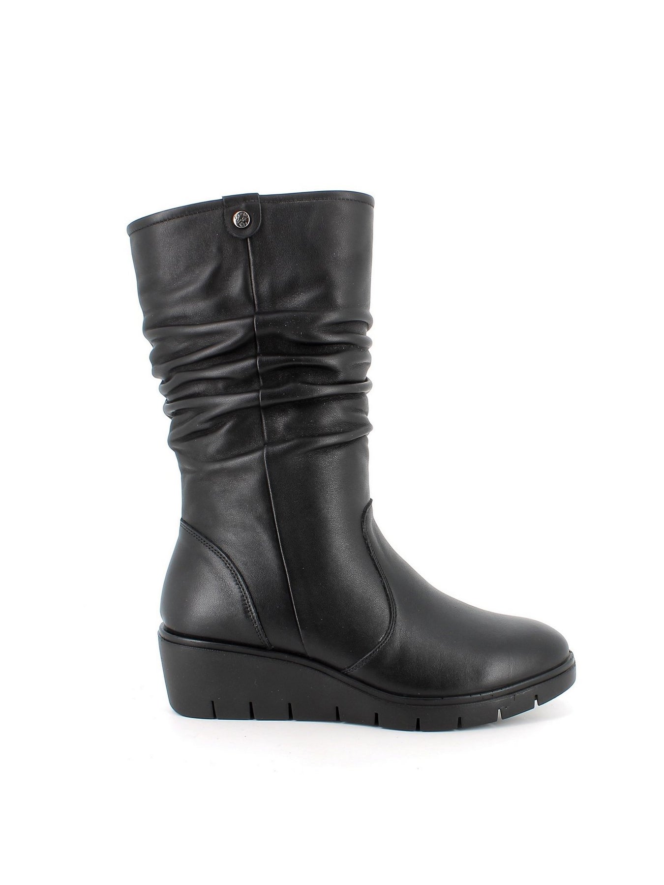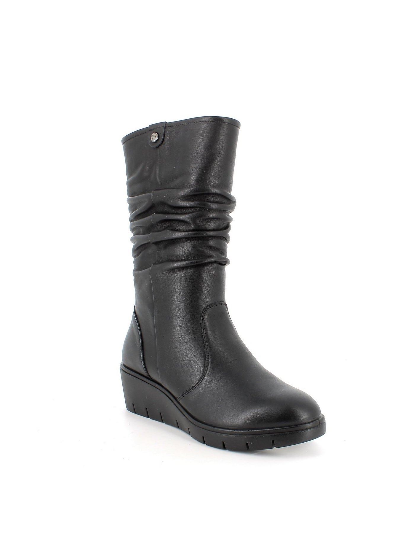 Realizzato in morbida pelle sintetica nera, questo stivale presenta un design sobrio ma sofisticato, con gambale arricciato e un bottone decorativo nella parte superiore per un tocco di eleganza discreta. La chiusura laterale con zip garantisce una calzata comoda e pratica, ideale per l'uso di tutti i giorni.