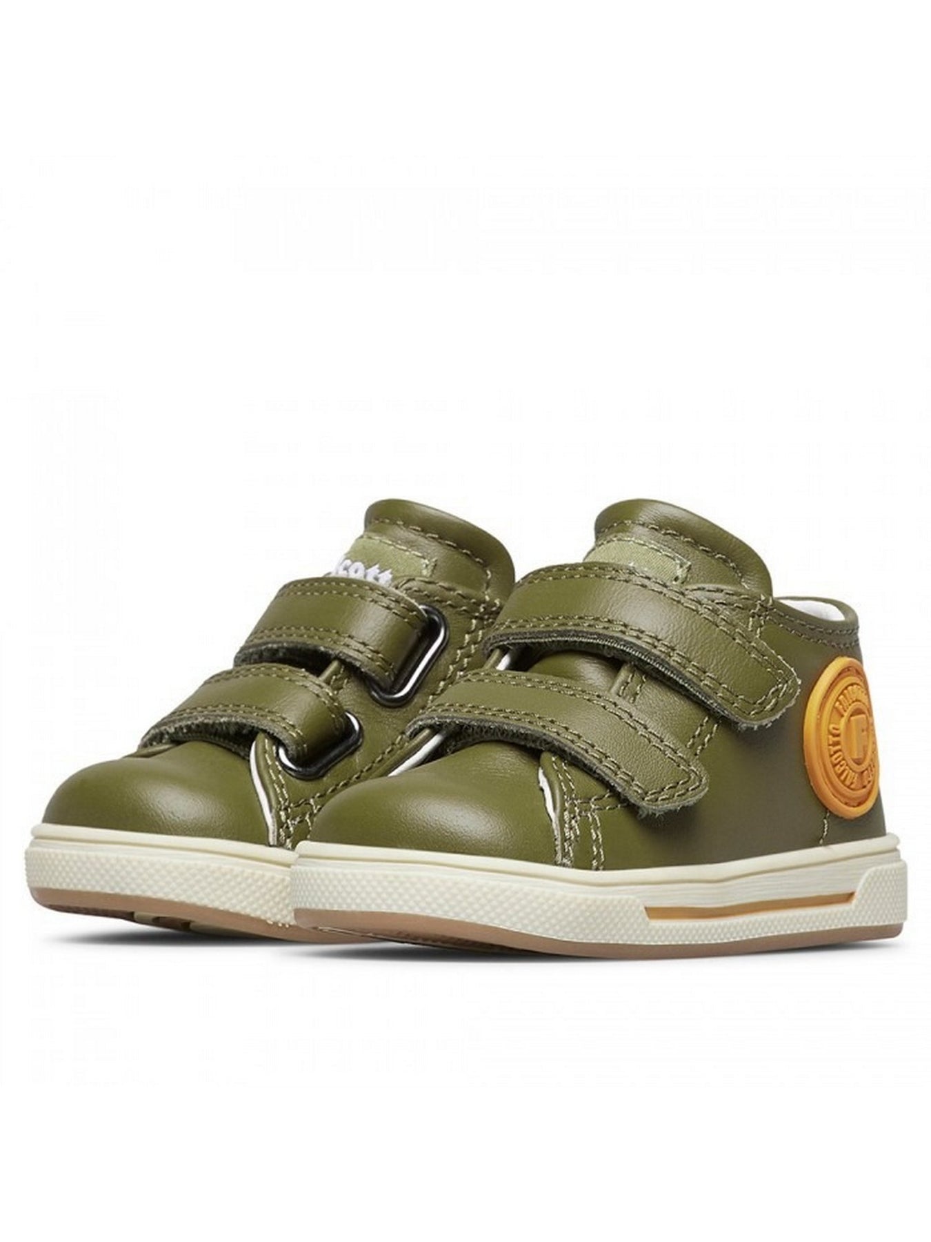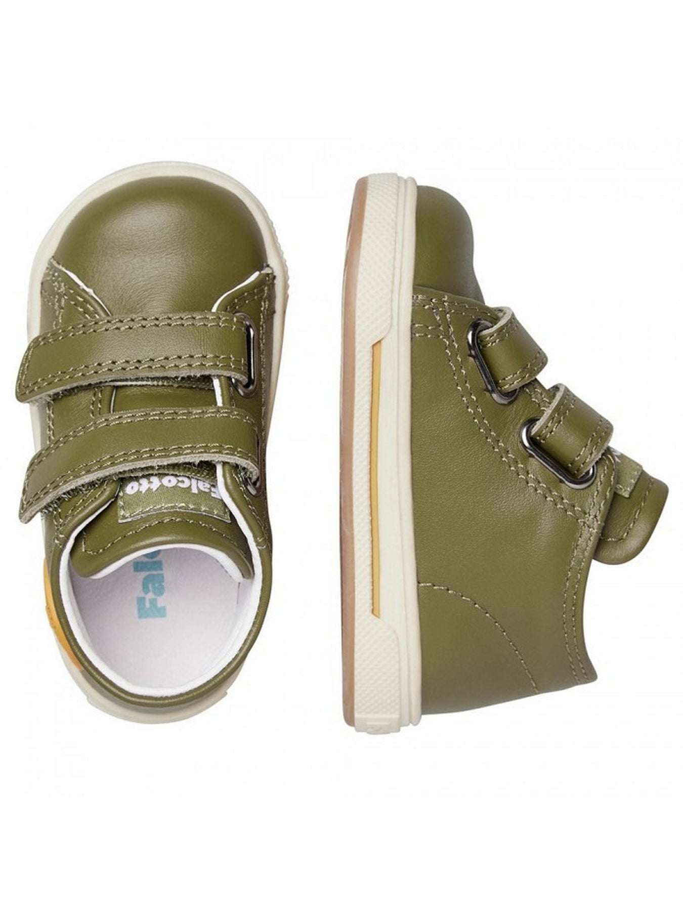 Realizzata in morbida pelle verde kaki, garantisce resistenza e traspirabilità, mentre la doppia chiusura a strappo permette una calzata veloce e regolabile. La suola in gomma antiscivolo e flessibile favorisce una camminata naturale e sicura, sostenendo lo sviluppo corretto del piede.