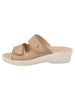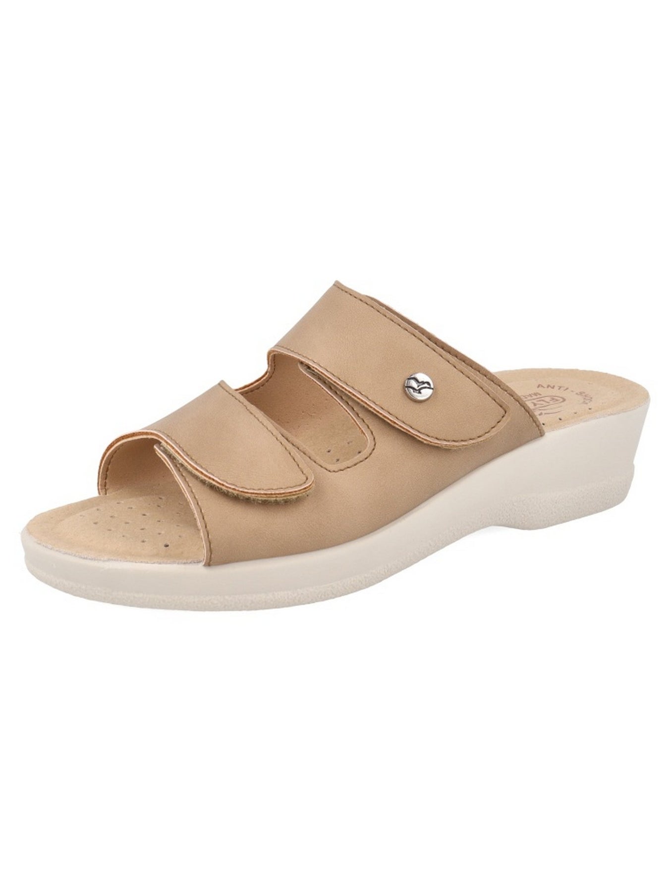 Tomaia Esterna: realizzata in morbida microfibra nella tonalità beige con doppia fascia regolabile, progettata per offrire comfort, leggerezza e una vestibilità adattabile al piede