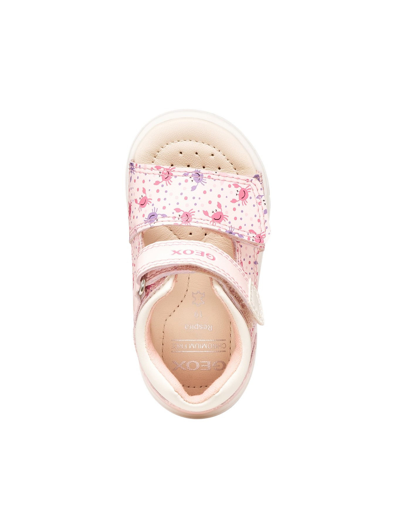 Tomaia Esterna: realizzata in materiale sintetico effetto pelle con stampa decorativa nelle tonalità light pink e white, progettata per offrire leggerezza, resistenza e uno stile giocoso e femminile