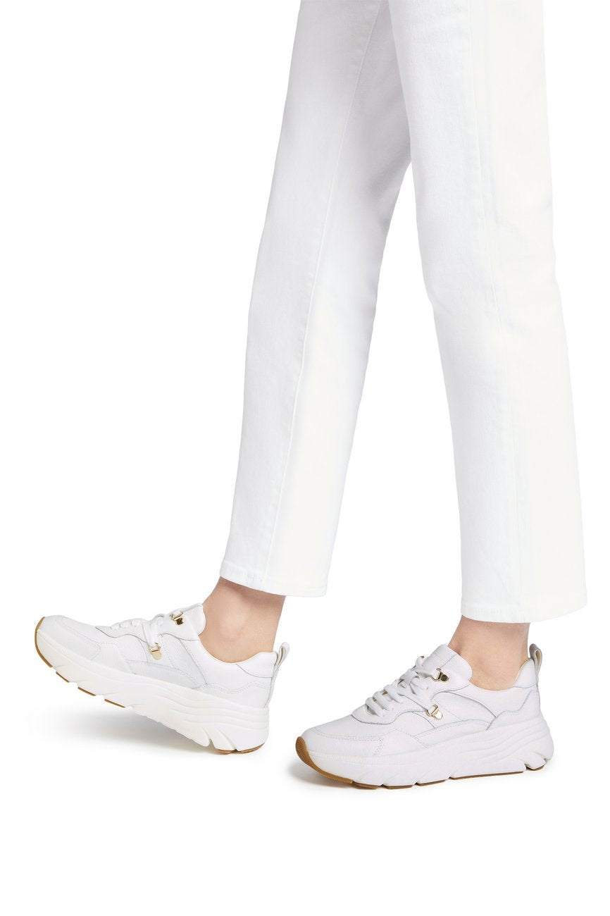 Realizzata in pelle bianca di alta qualità con inserti in tessuto tecnico, questa sneaker con zeppa presenta linee moderne e una silhouette grintosa, perfetta per valorizzare ogni outfit casual o sporty-chic. La chiusura con lacci garantisce una calzata stabile e personalizzabile, mentre i dettagli metallici aggiungono un tocco di eleganza.