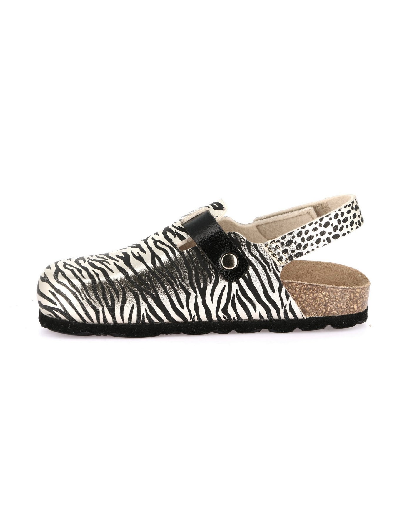 La chiusura regolabile con fibbia laterale e il cinturino posteriore garantiscono una calzata stabile e sicura. Il plantare anatomico in sughero naturale assicura comfort e traspirazione durante tutta la giornata.