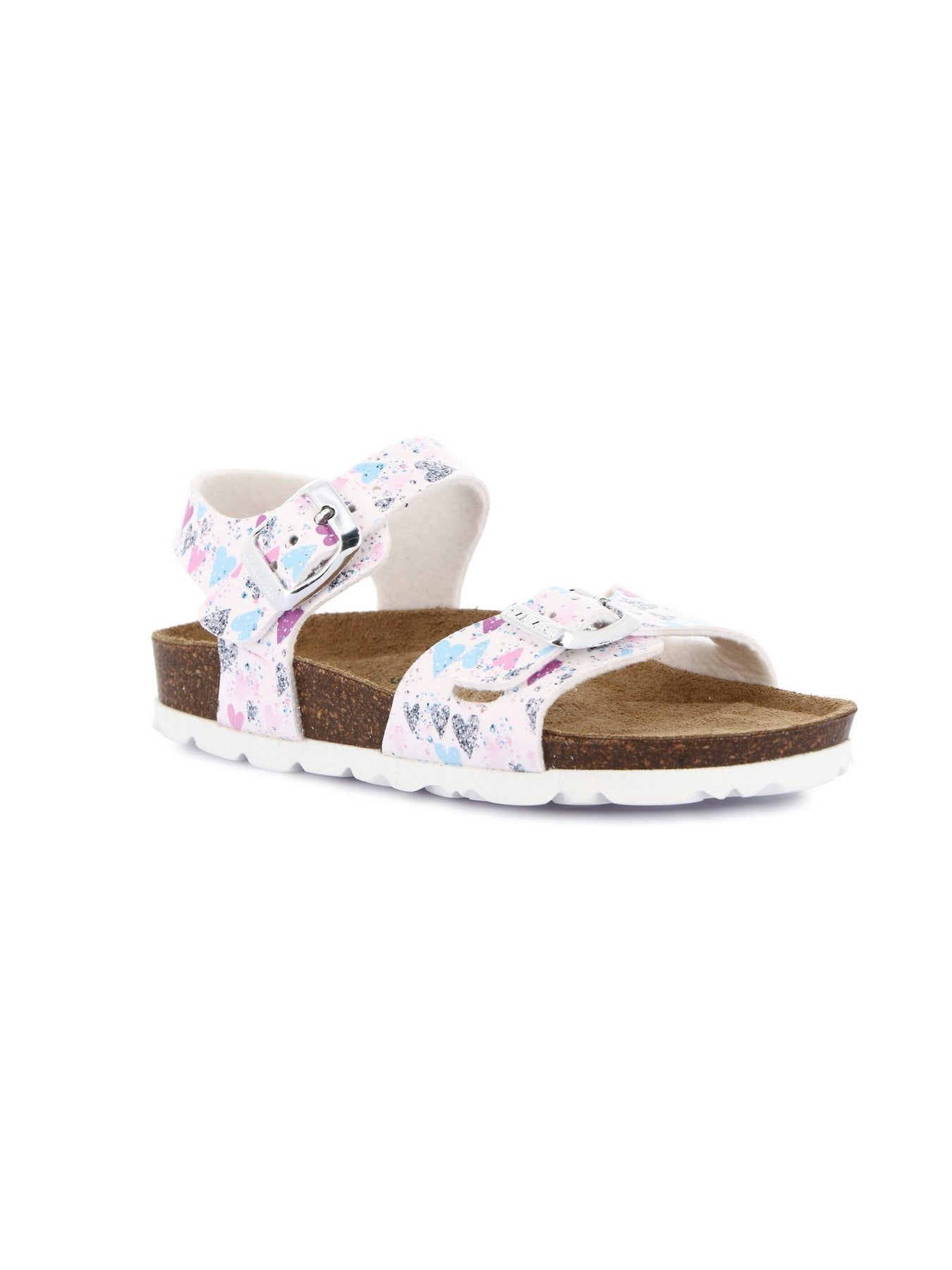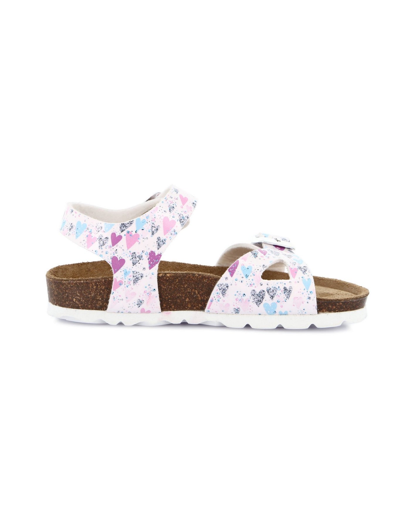 Realizzato con una tomaia sintetica bianca arricchita da motivi multicolor, unisce vivacità e praticità in un unico modello. La suola anatomica in sughero naturale e gomma ammortizzata garantisce un sostegno ideale durante le giornate più attive.
