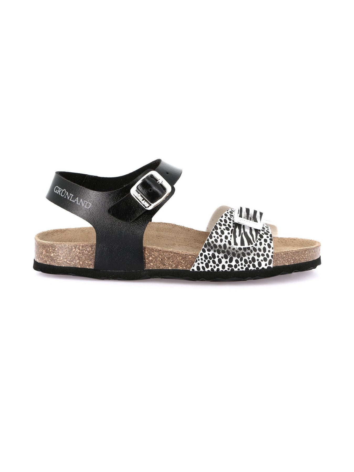 Realizzato con una tomaia sintetica in fantasia bianco/nero effetto animalier, combina un look deciso con il massimo della comodità. La suola anatomica in sughero naturale e gomma ammortizzata assicura stabilità e leggerezza in ogni momento della giornata.
