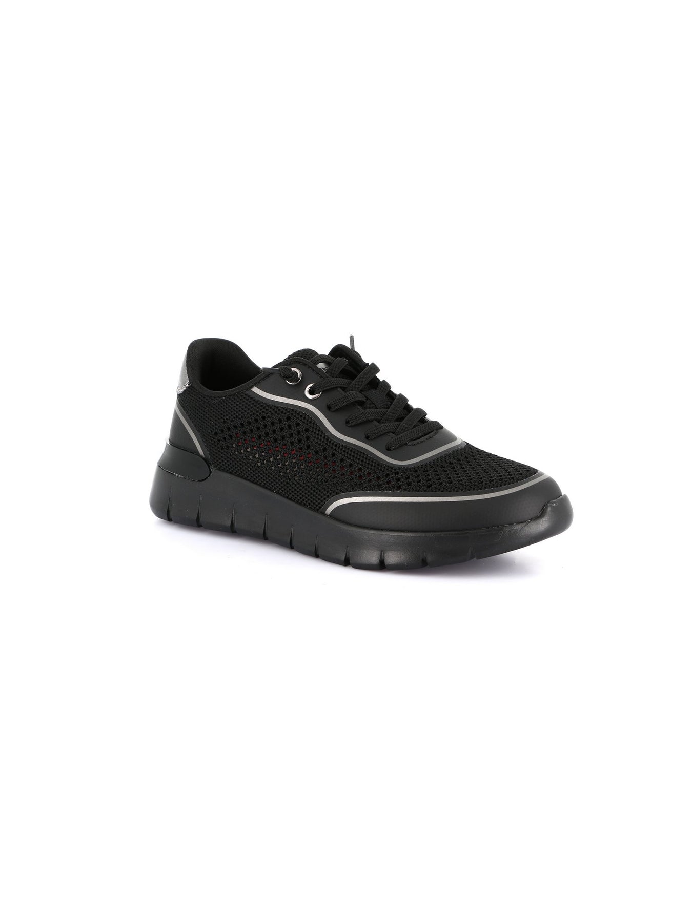 Tomaia Esterna: materiale effetto pelle nero con inserti traforati laterali per favorire traspirabilità e leggerezza