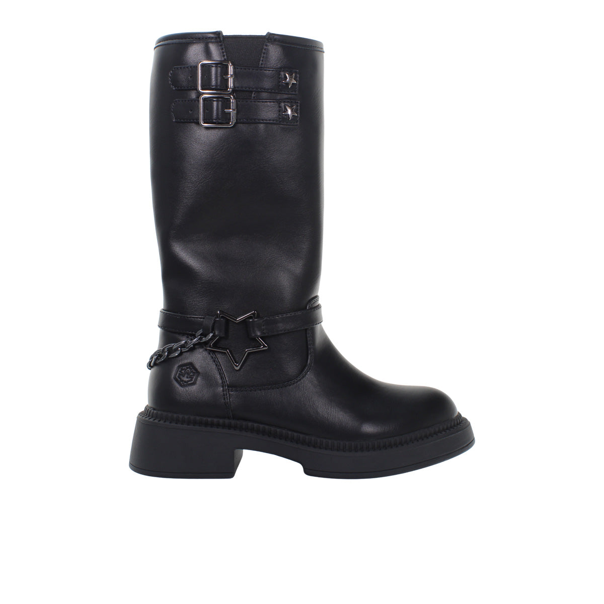 Realizzato in pelle sintetica nera, si caratterizza per il design alto arricchito da doppi cinturini con fibbie laterali e da un cinturino con stella decorativa a catena, che donano un tocco fashion e grintoso.
