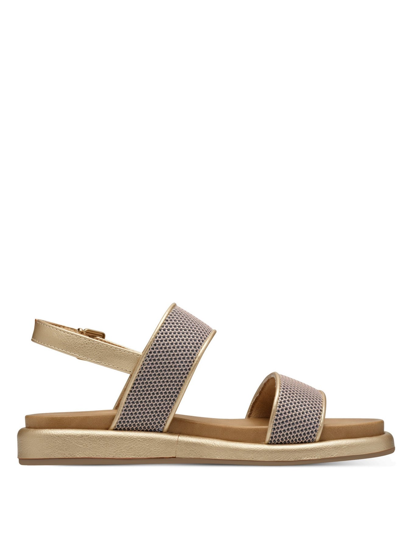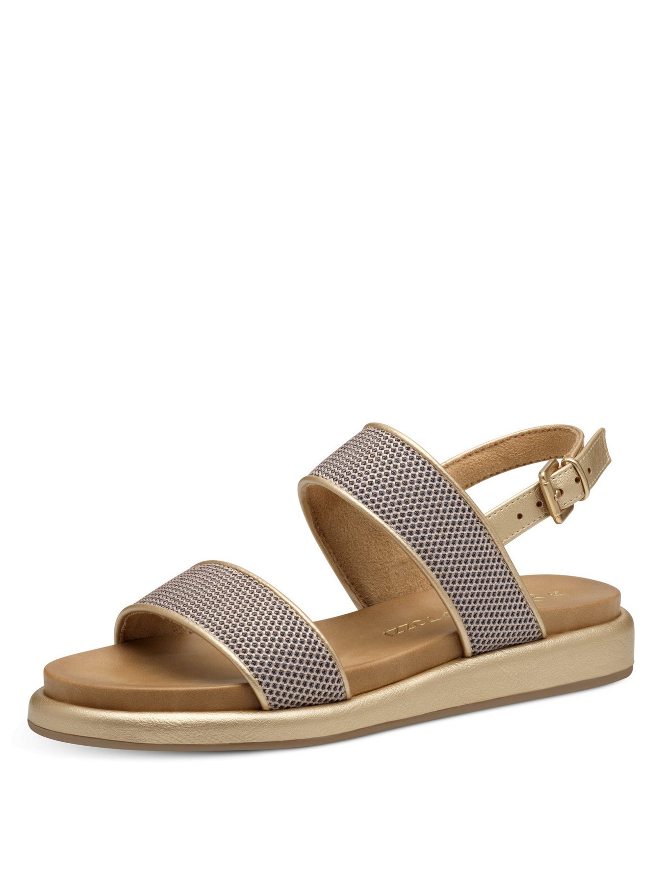 Il sandalo basso MARCO TOZZI 2-28425-44 nella colorazione Gold Comb unisce eleganza e comfort in un design moderno e luminoso. Perfetto per l'estate, questo modello presenta due fasce larghe con dettagli scintillanti e una comoda chiusura con fibbia regolabile alla caviglia.