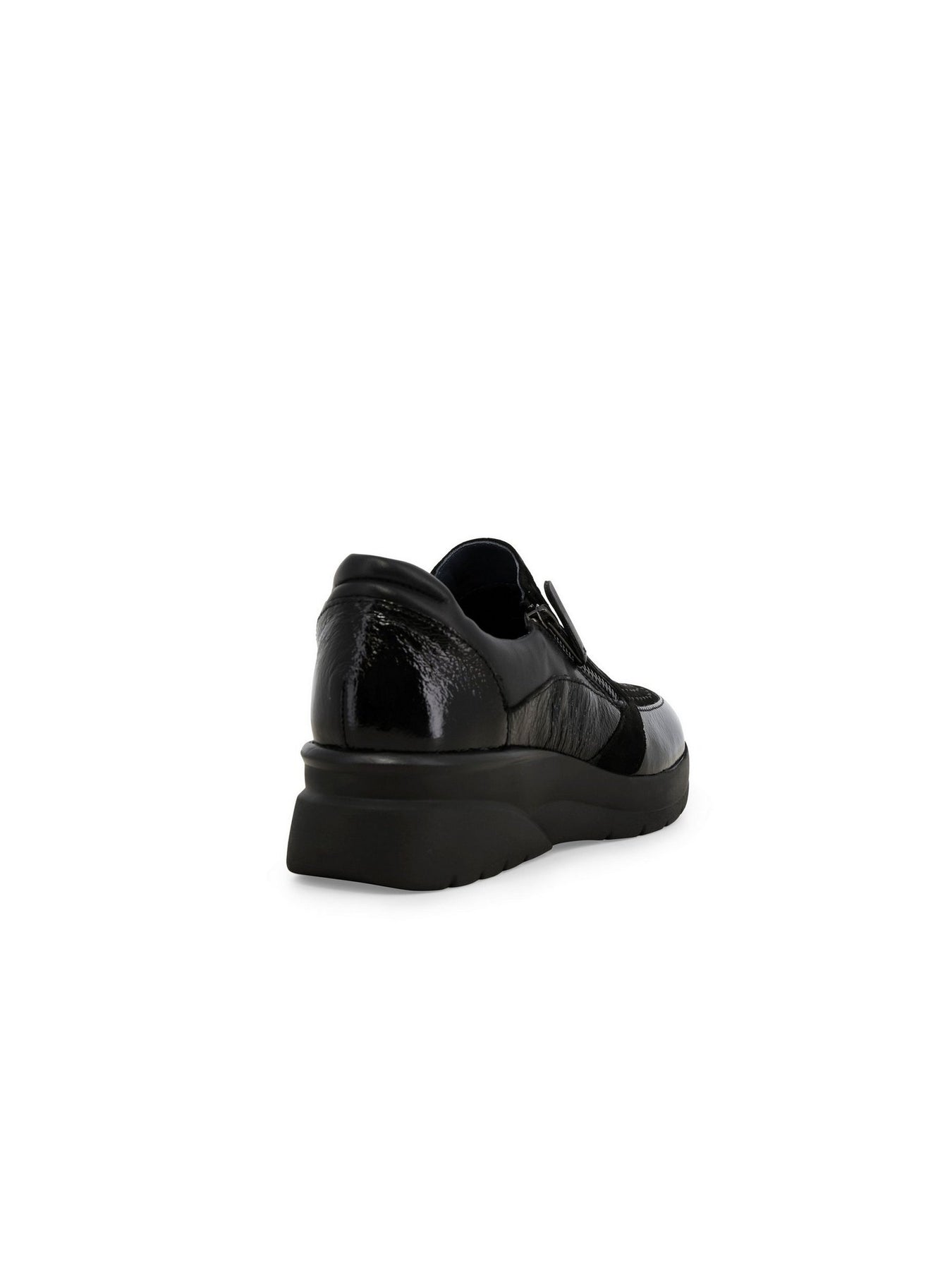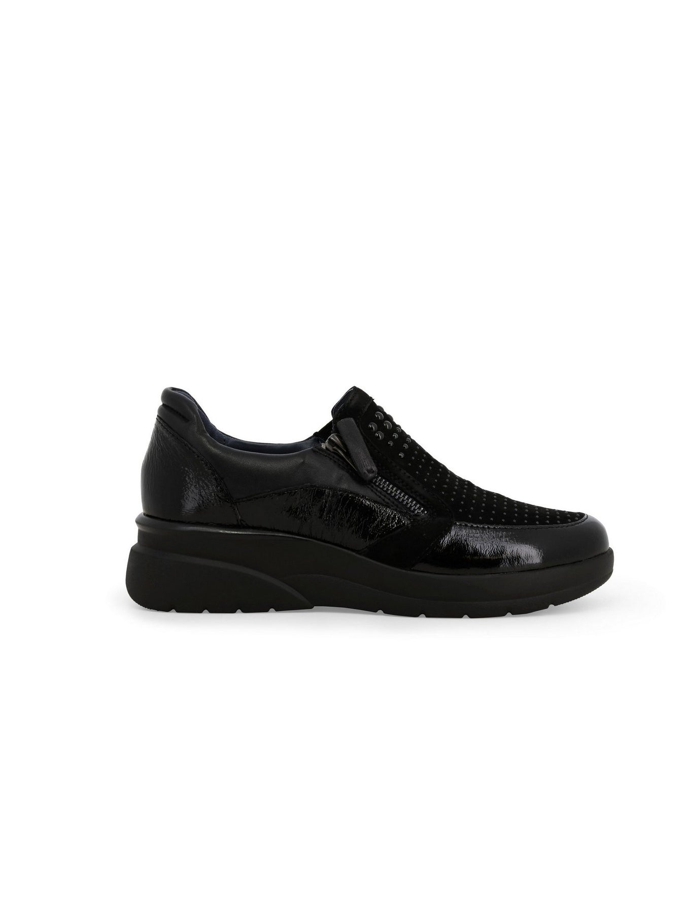 Realizzato in pelle verniciata nera con inserti elasticizzati effetto rete, questo mocassino Melluso unisce design e funzionalità in una struttura leggera e confortevole. La cerniera laterale facilita la calzata, offrendo praticità e una perfetta aderenza al piede.