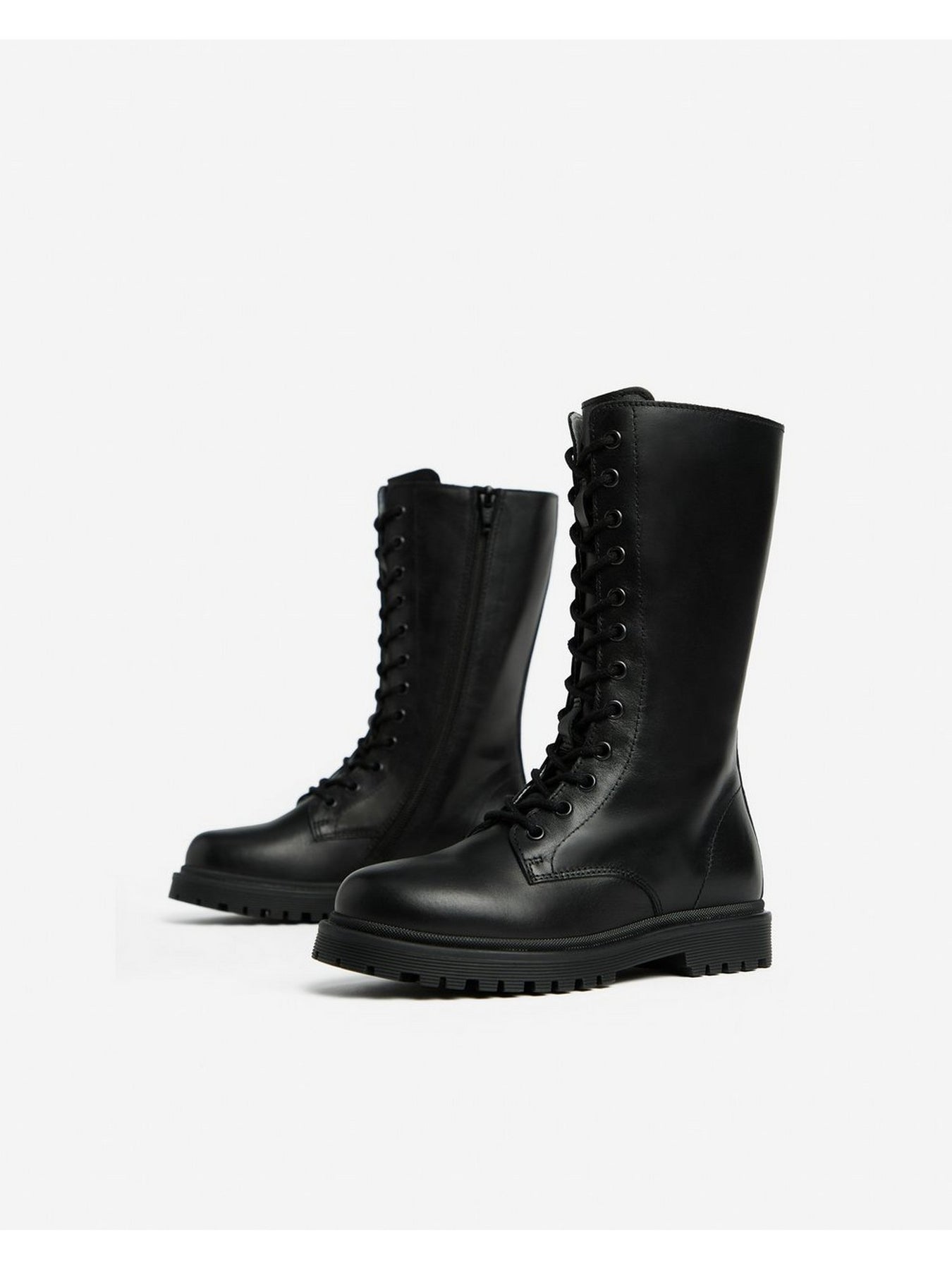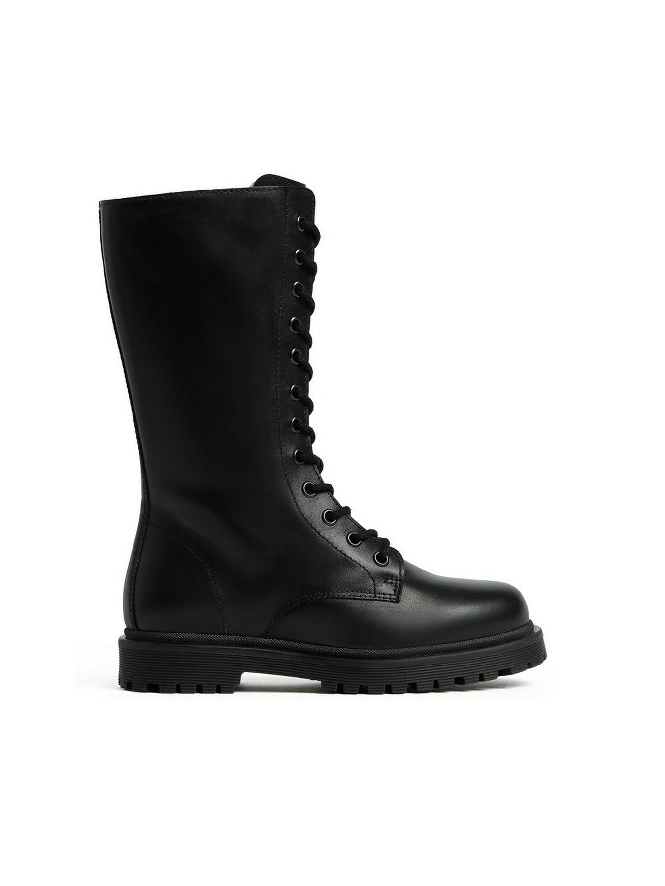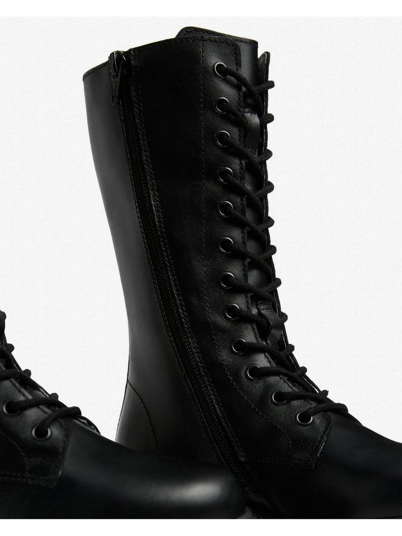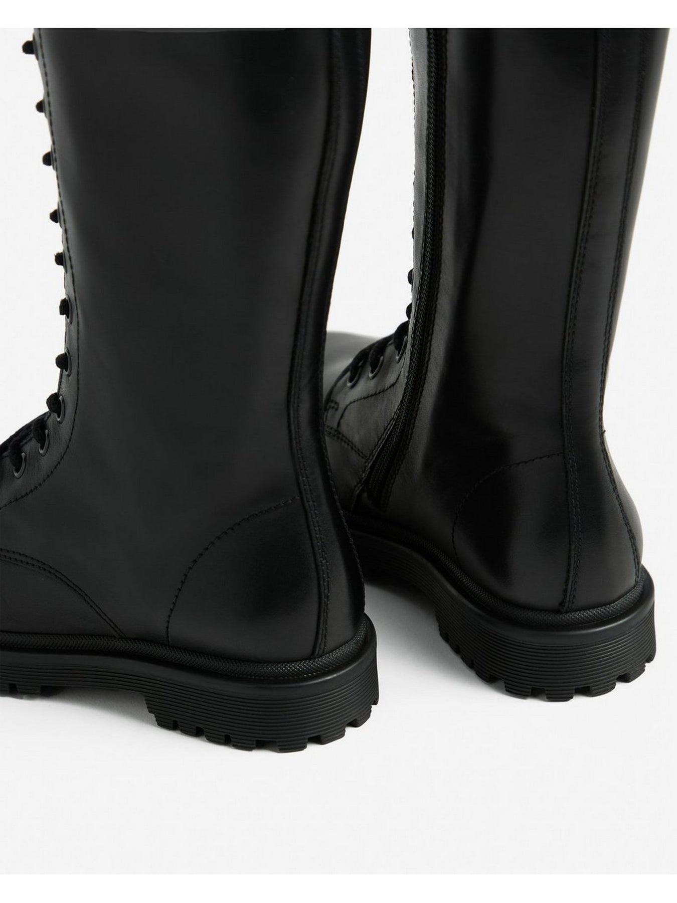 Realizzati in pelle nera di alta qualità, questi anfibi presentano una linea alta con chiusura a stringhe frontale e cerniera laterale che facilita la calzata. Il design robusto e la suola in gomma dentata assicurano stabilità, aderenza e resistenza nel tempo, perfetti per affrontare con stile anche le giornate più dinamiche.