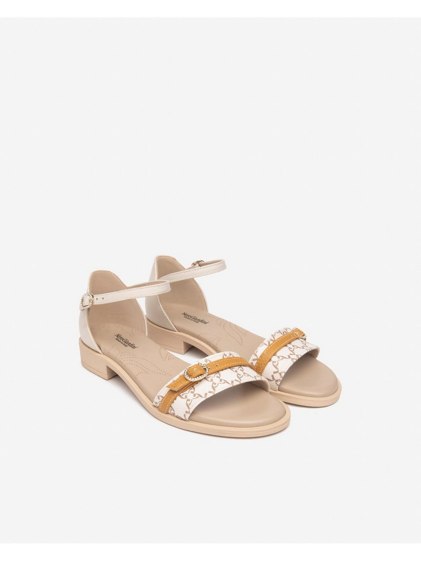 Il sandalo con tacco basso NERO GIARDINI E513427D nella tonalità Beige è la scelta ideale per chi cerca comodità ed eleganza quotidiana. Il design minimal e raffinato, con dettagli in pelle beige e inserti fantasia, rende questo modello versatile e perfetto per ogni outfit estivo, dal più casual al più sofisticato.