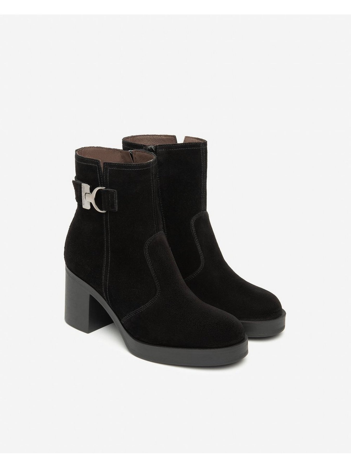 La chiusura con zip laterale rende la calzata pratica e veloce, mentre la suola in gomma assicura stabilità e resistenza. Il tacco a blocco da 7,5 cm slancia la figura senza rinunciare alla comodità.