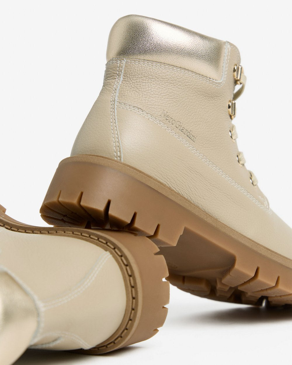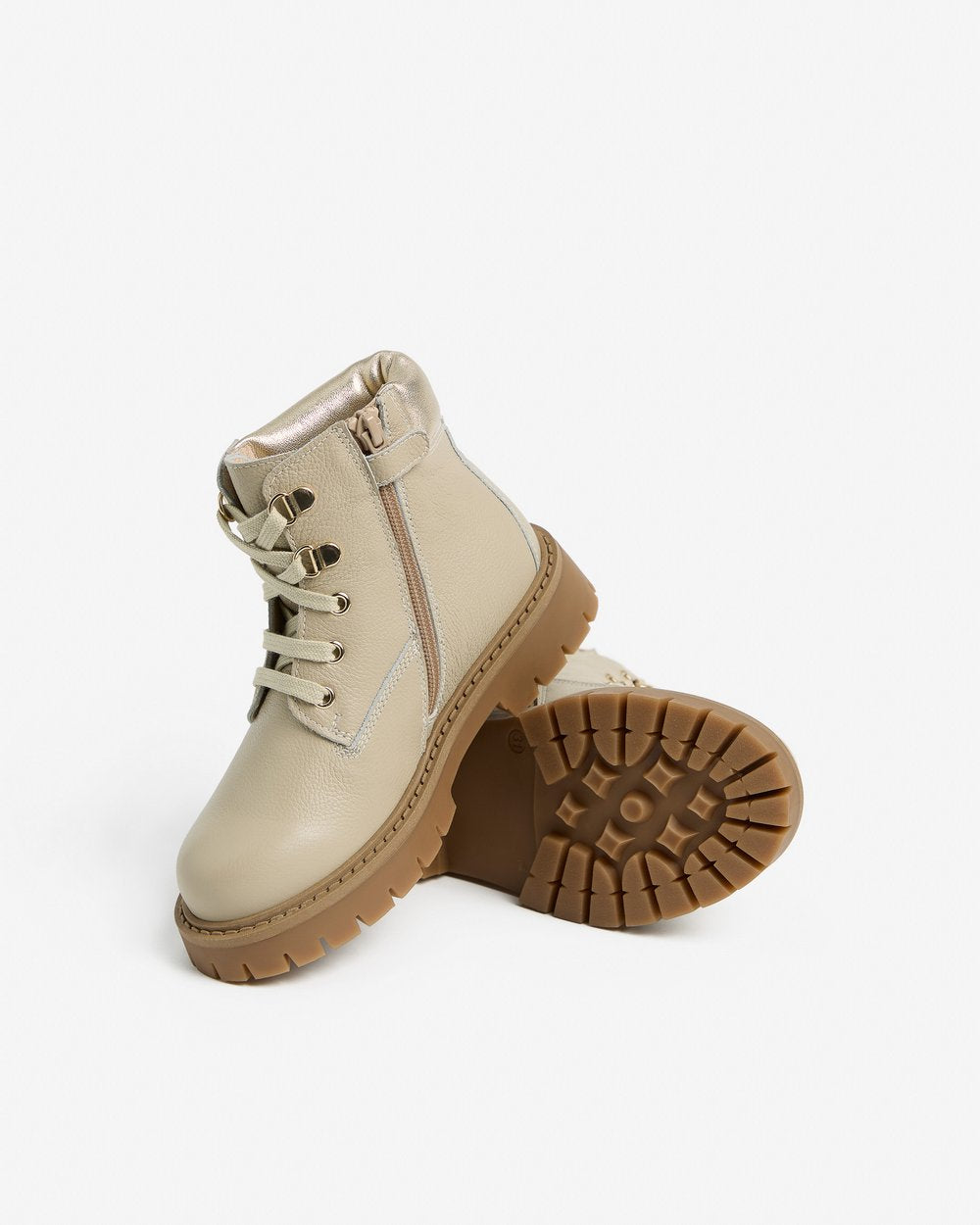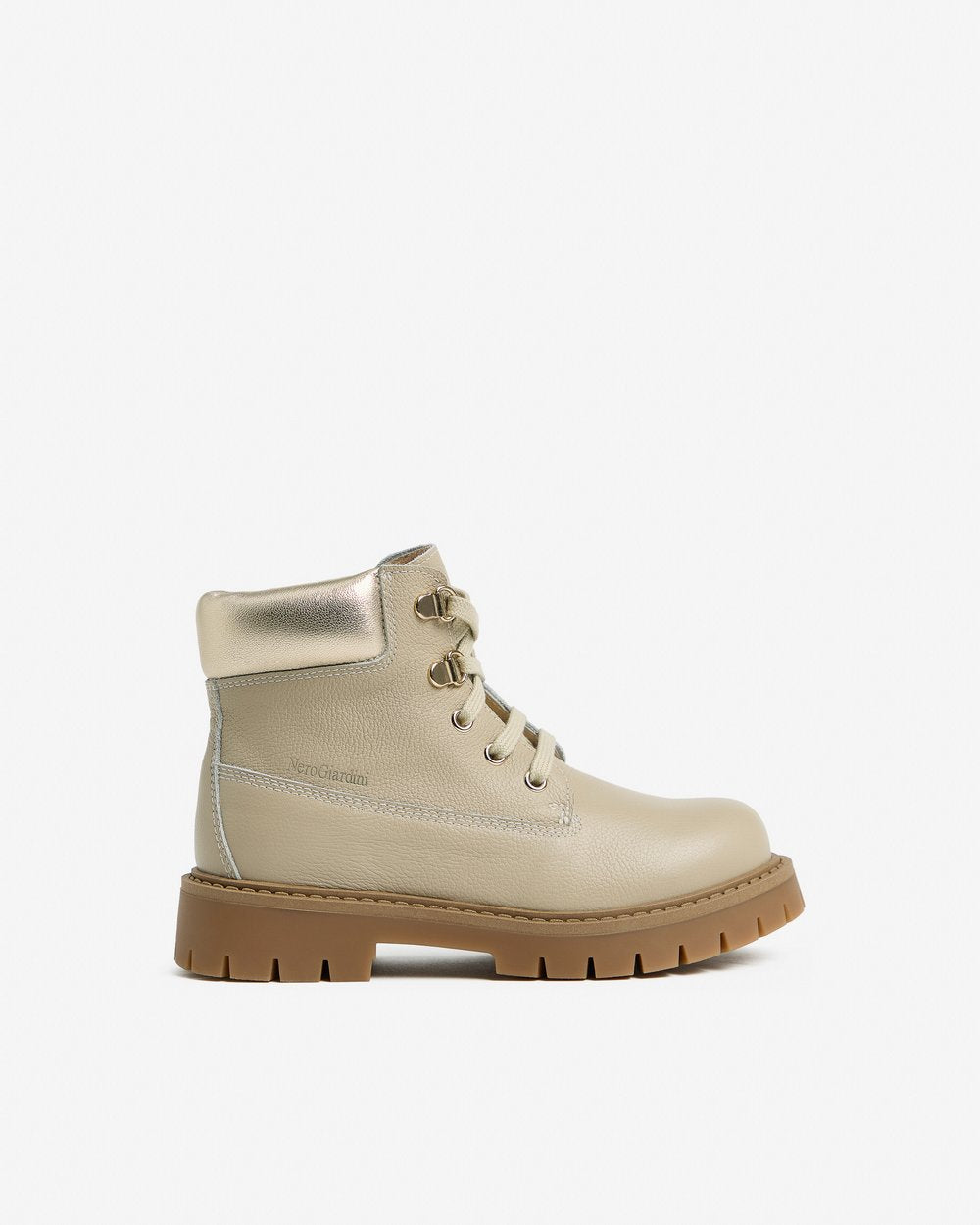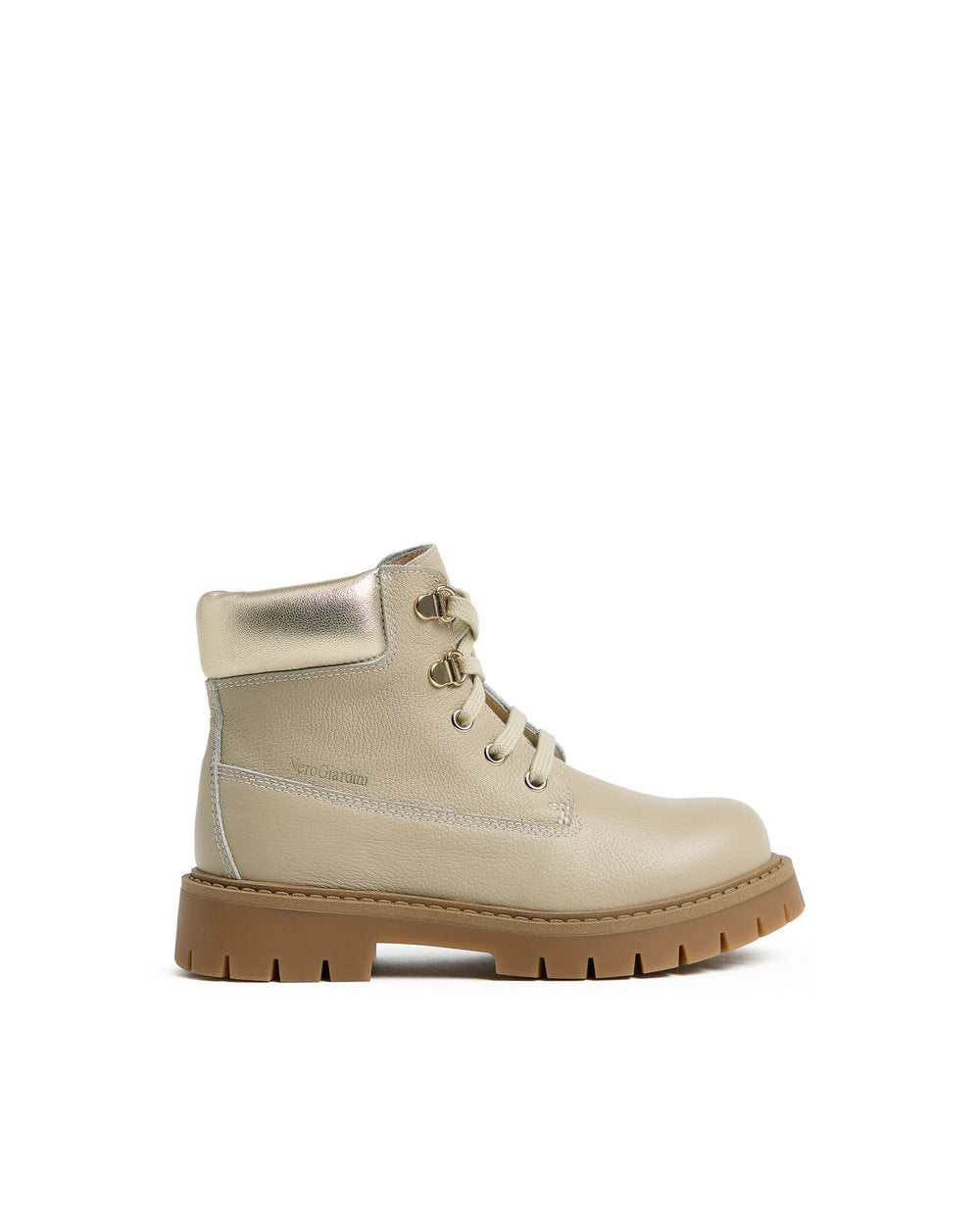 Realizzato in pelle color beige, presenta inserti metallizzati sul collarino che aggiungono un tocco luminoso e femminile. La chiusura con lacci e zip laterale garantisce una calzata comoda e veloce.