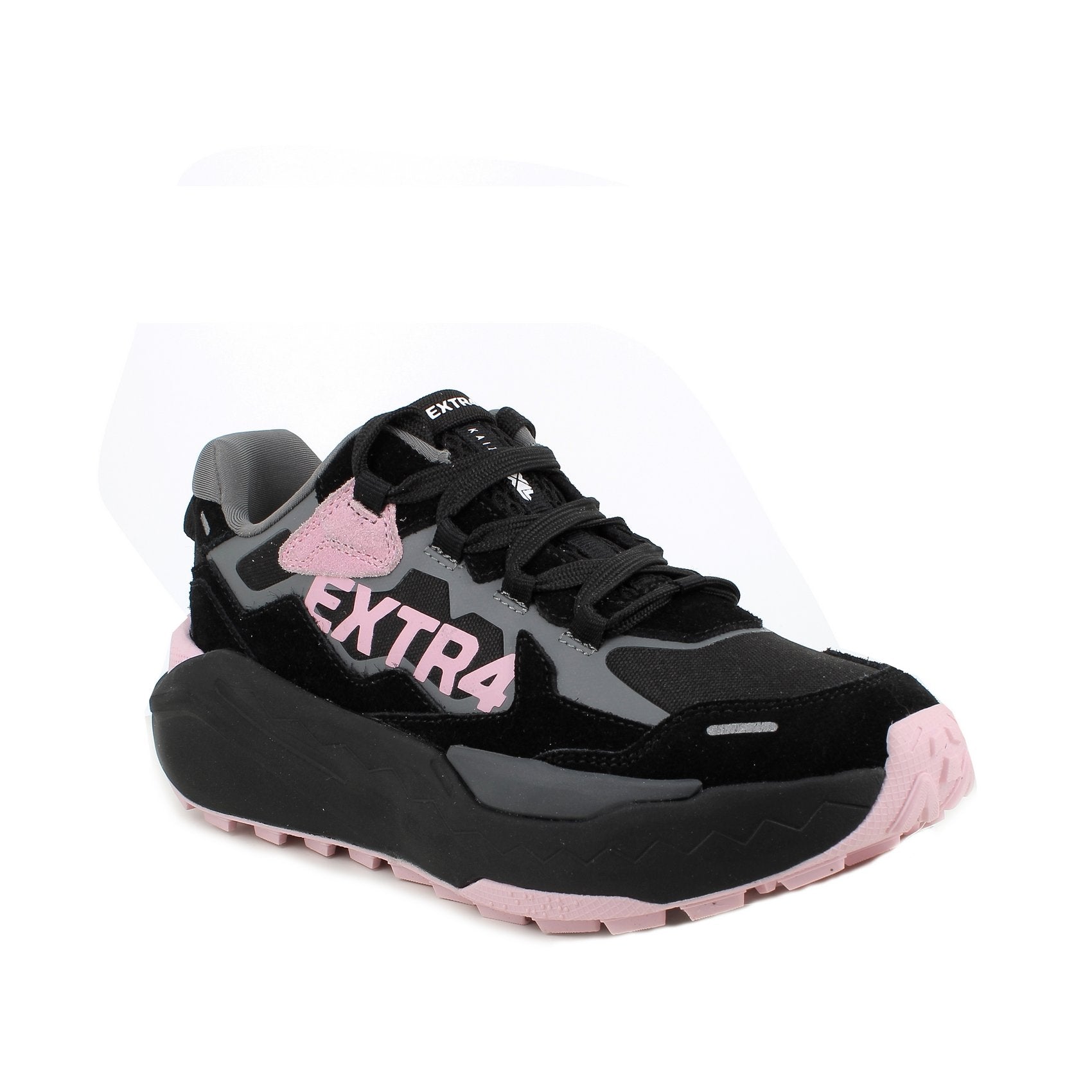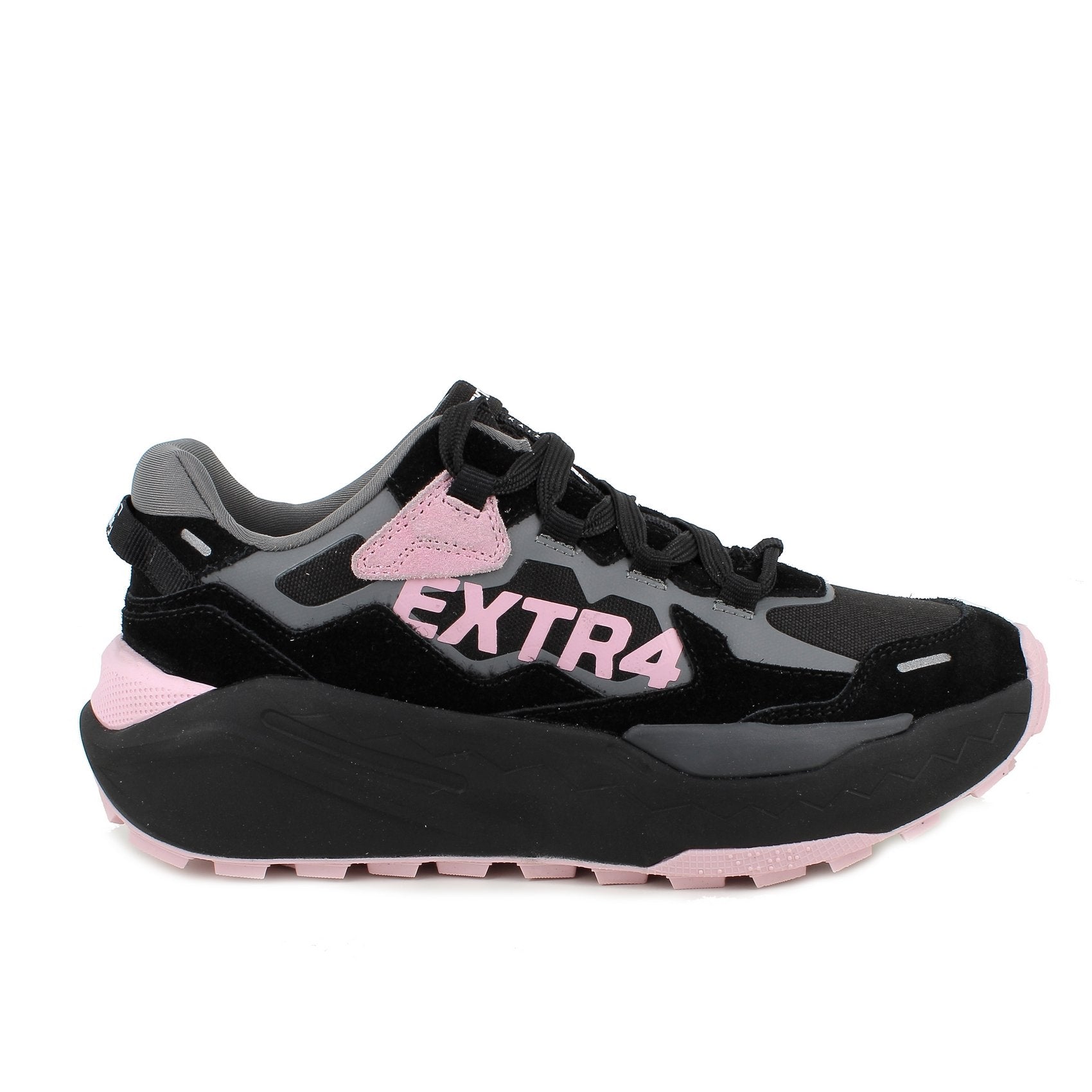 Realizzata in pelle e tessuto nei toni del nero e rosa, è caratterizzata dal logo laterale EXTR4 e da inserti a contrasto che donano un look dinamico e trendy. La suola chunky in gomma nera con dettagli rosa garantisce stabilità, resistenza e un tocco fashion che rende la sneaker protagonista di ogni outfit.