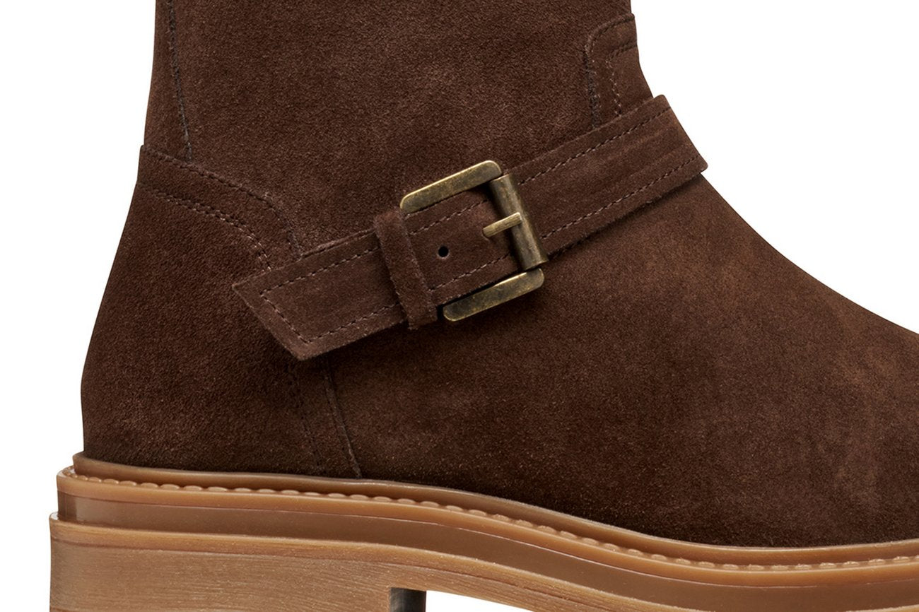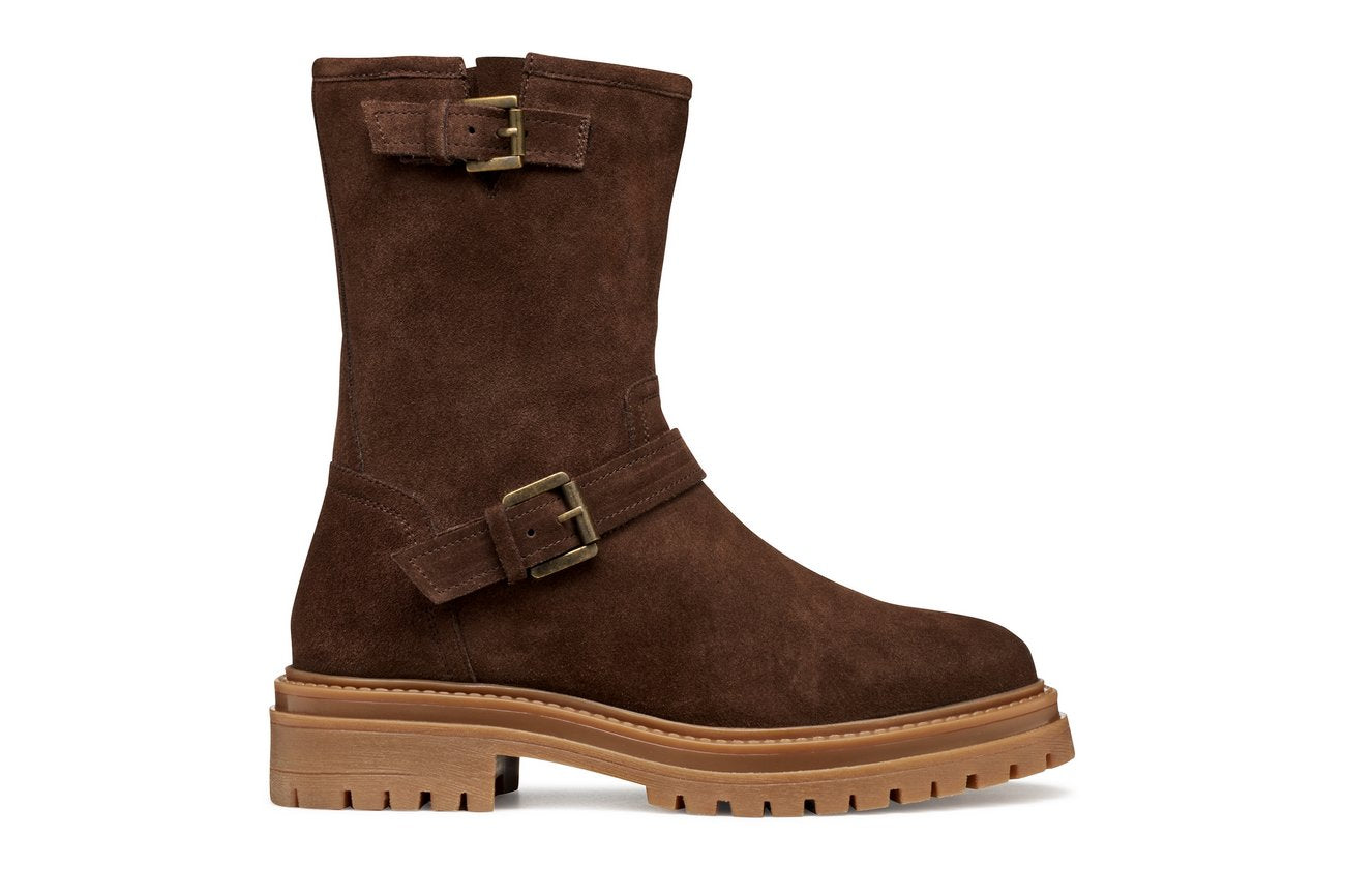 Realizzato in morbido camoscio marrone scuro, è impreziosito da due fibbie regolabili che donano un tocco biker-chic al design. La zip laterale rende la calzata rapida e pratica, mentre il tacco basso da 4 cm e la suola carrarmato assicurano stabilità, comfort e resistenza. La tecnologia traspirante GEOX garantisce benessere al piede per tutta la giornata.