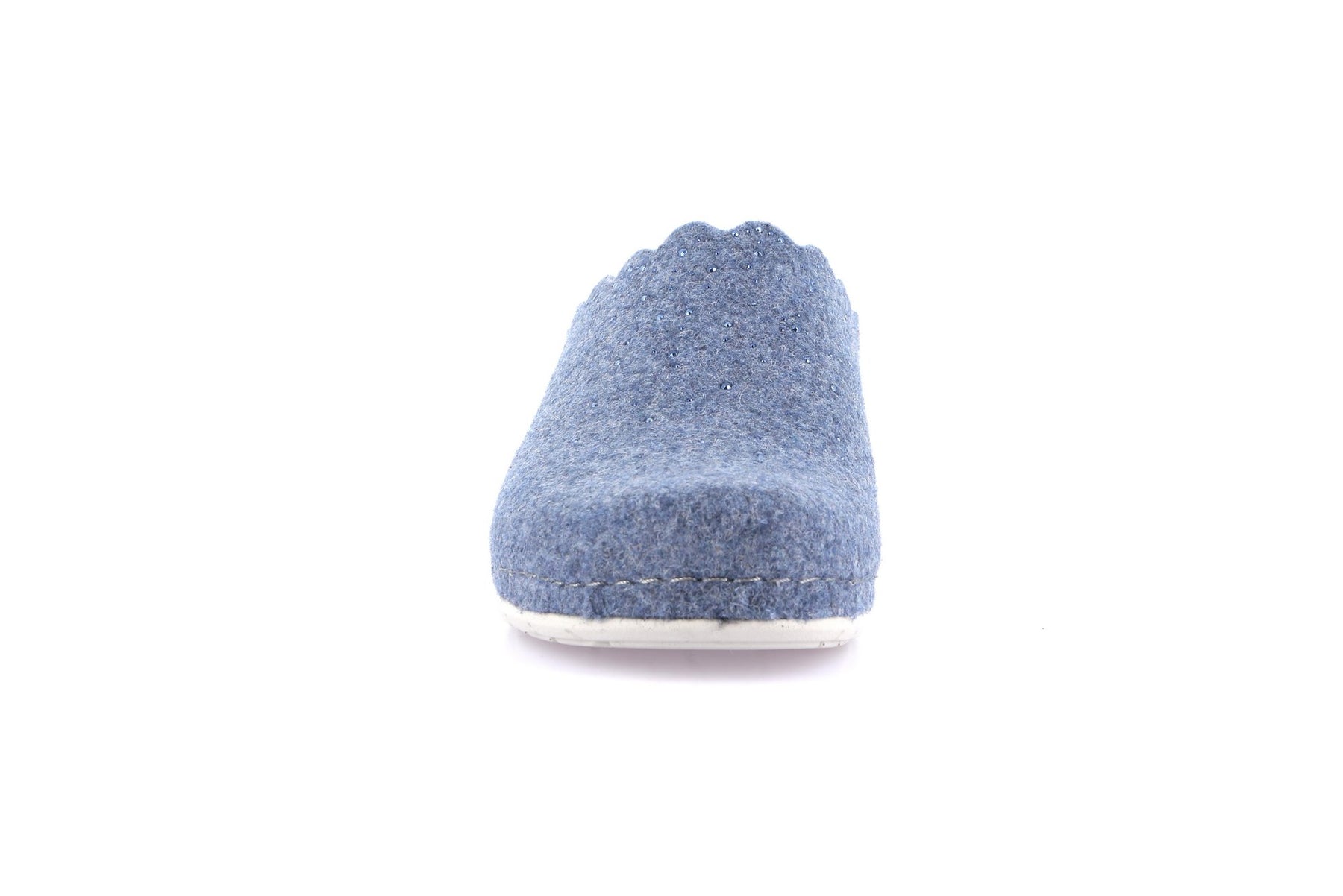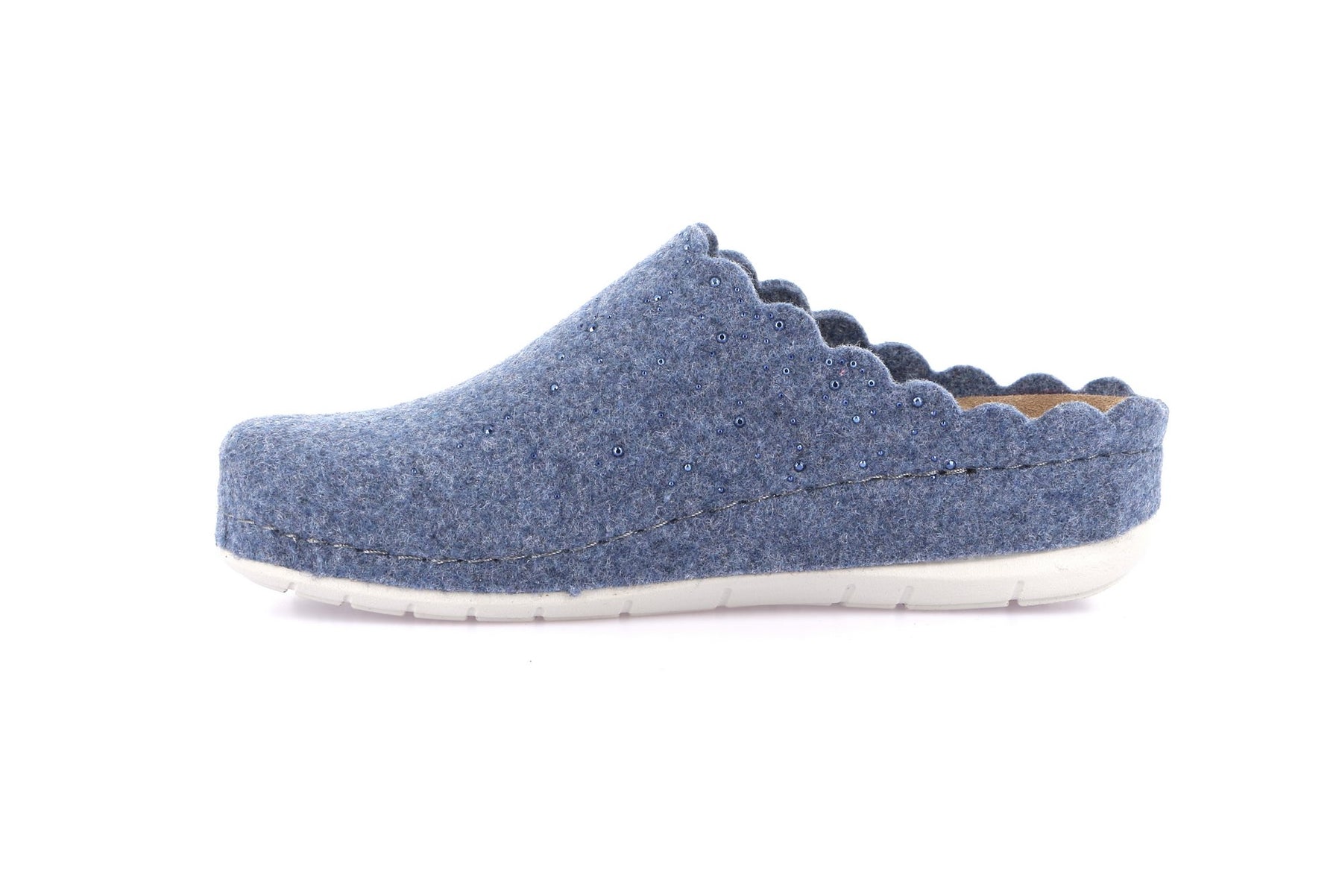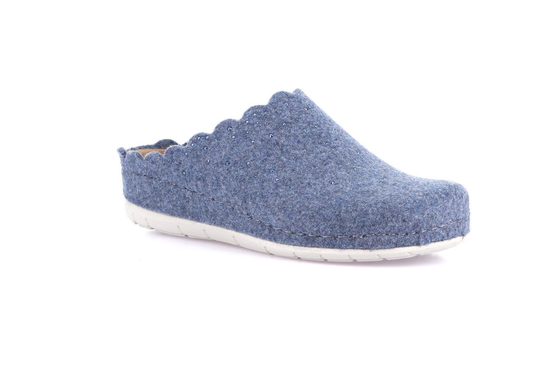 Realizzata in morbido feltro traspirante, avvolge il piede mantenendolo caldo e comodo in ogni stagione. Il profilo ondulato conferisce un tocco raffinato e femminile, mentre la suola in gomma leggera e flessibile assicura stabilità, aderenza e resistenza.
