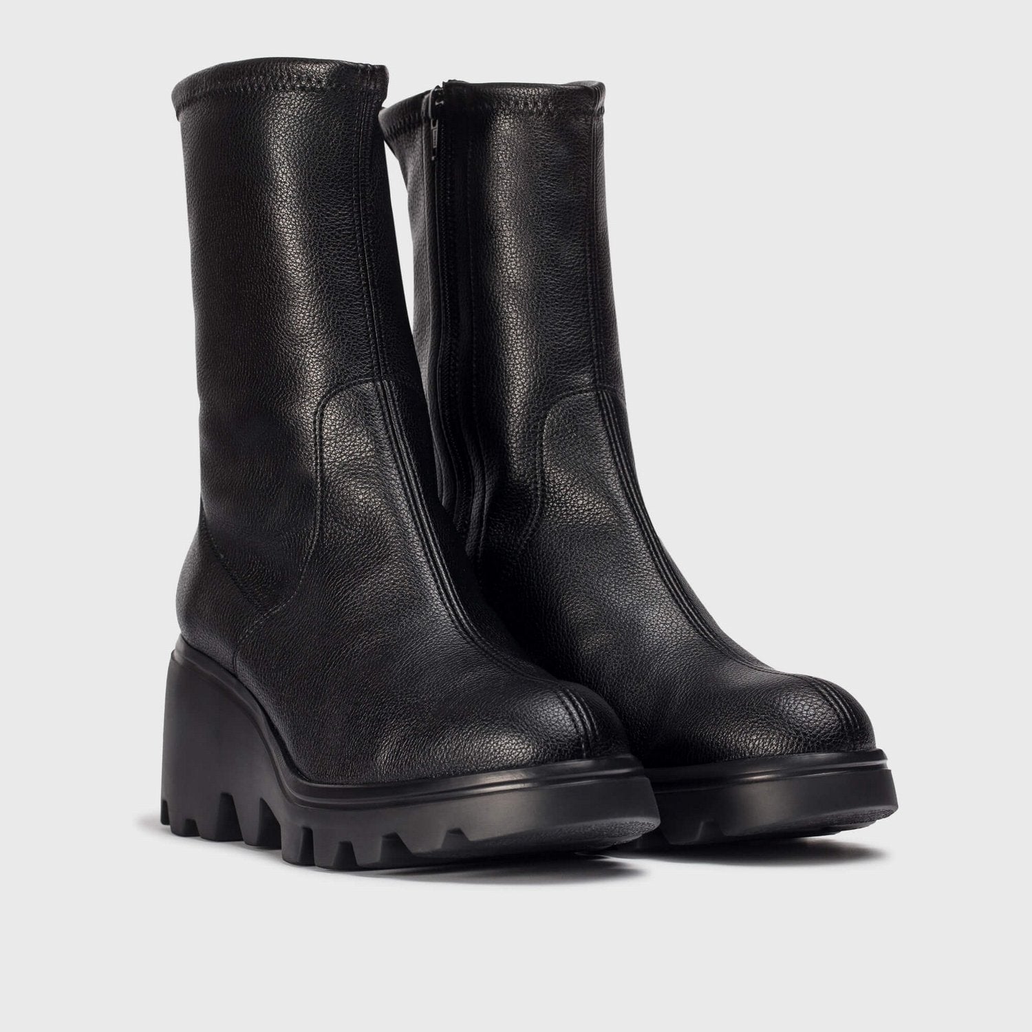 Realizzato in morbida pelle nera, presenta linee minimal ed essenziali che lo rendono versatile e facilmente abbinabile a diversi look. La zeppa platform da 6 cm garantisce altezza e slancio alla silhouette, mentre la suola carrarmato dentellata assicura aderenza e stabilità su ogni superficie.