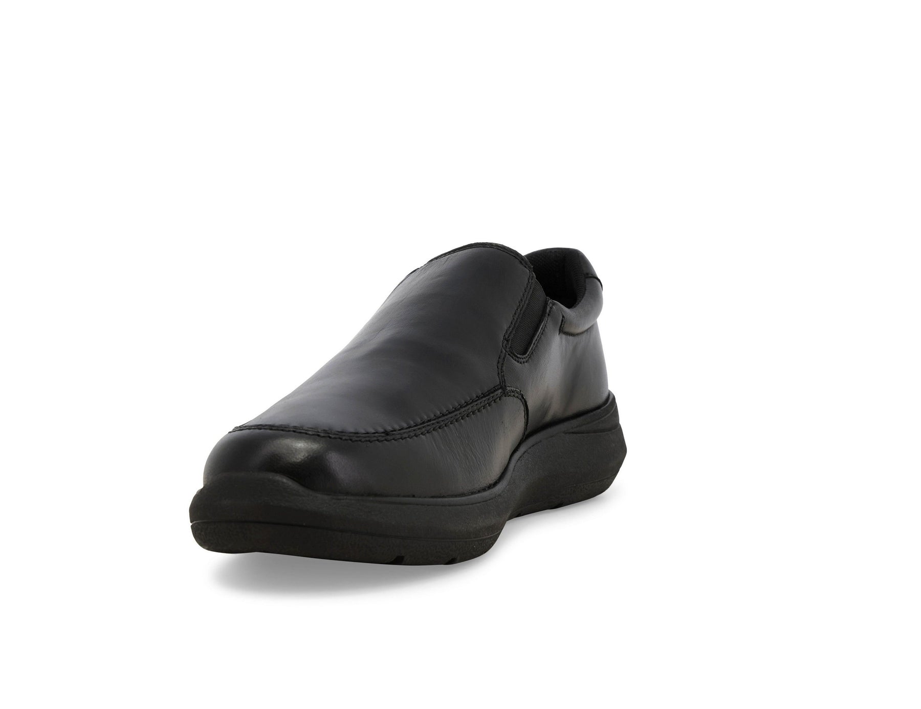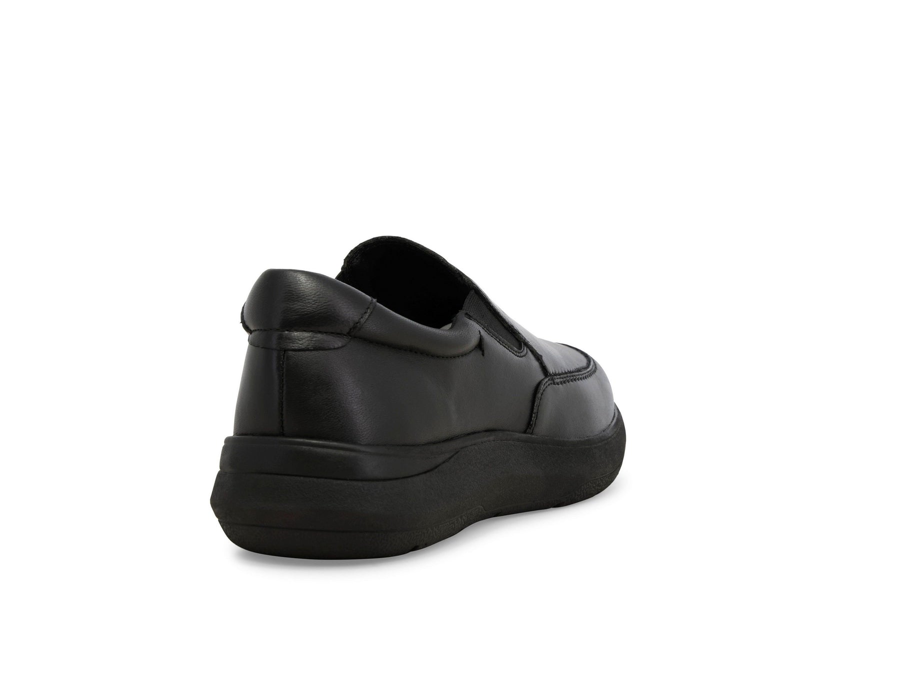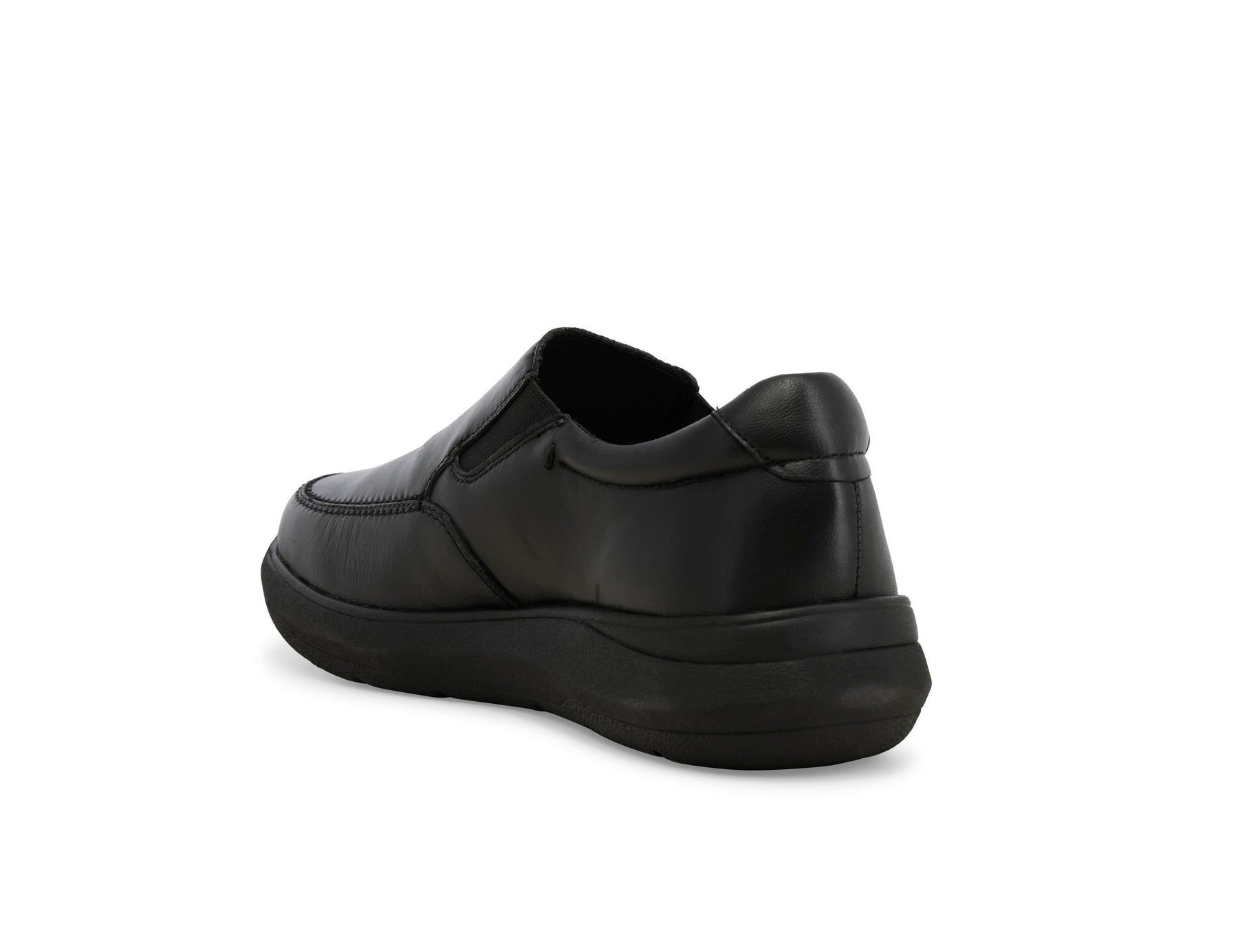 Realizzato in pelle liscia nera di alta qualità, presenta un design essenziale con cuciture discrete e inserti elastici laterali, che permettono una calzata facile e veloce.