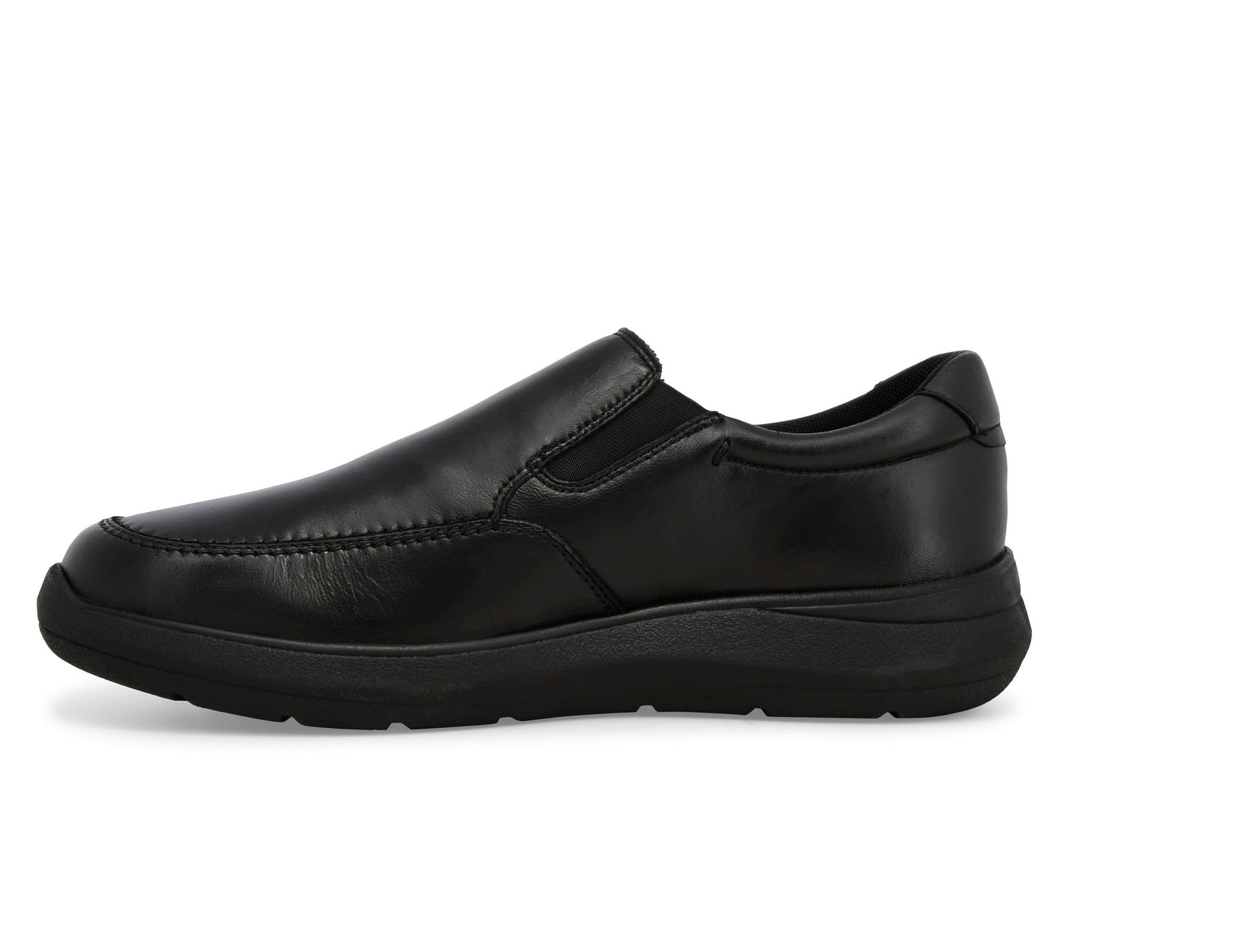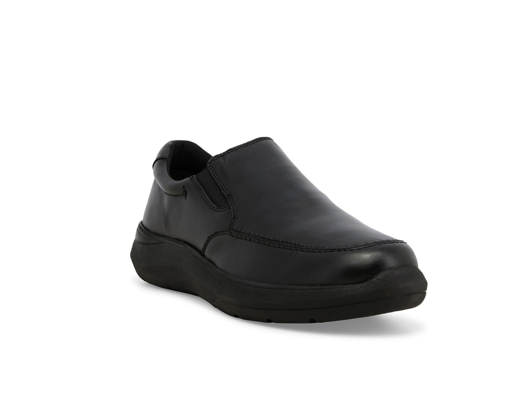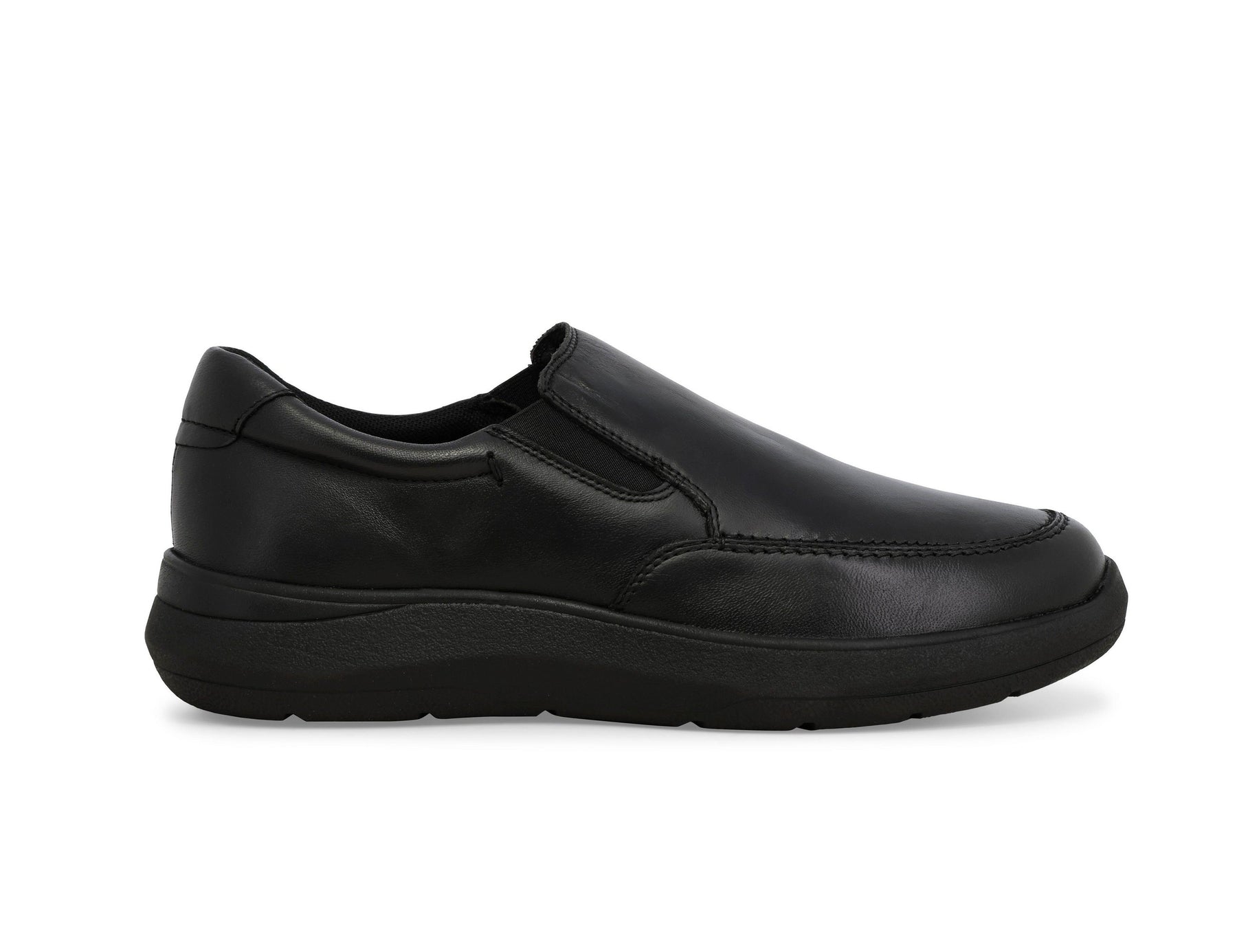 Realizzato in pelle liscia nera di alta qualità, presenta un design essenziale con cuciture discrete e inserti elastici laterali, che permettono una calzata facile e veloce.