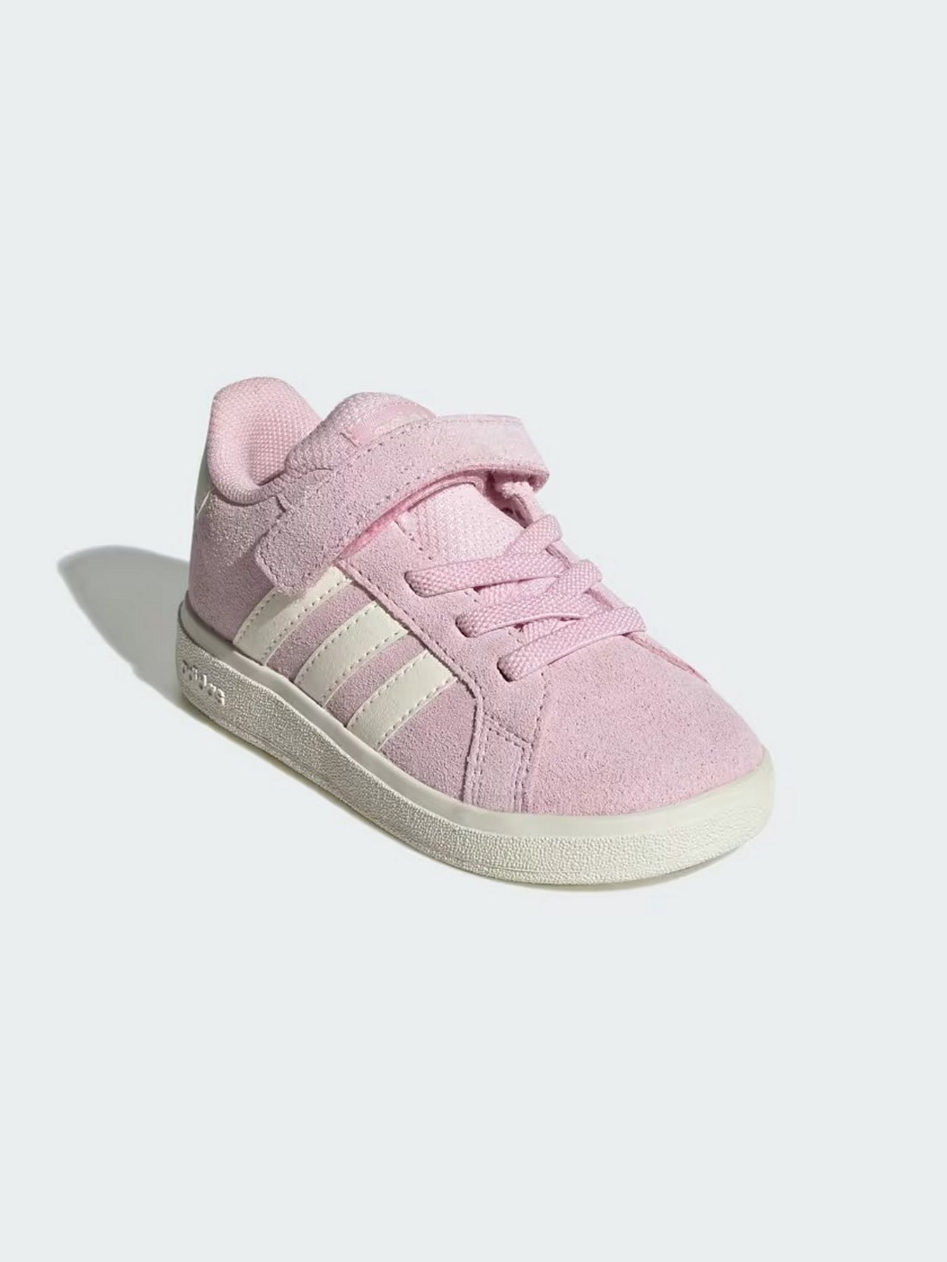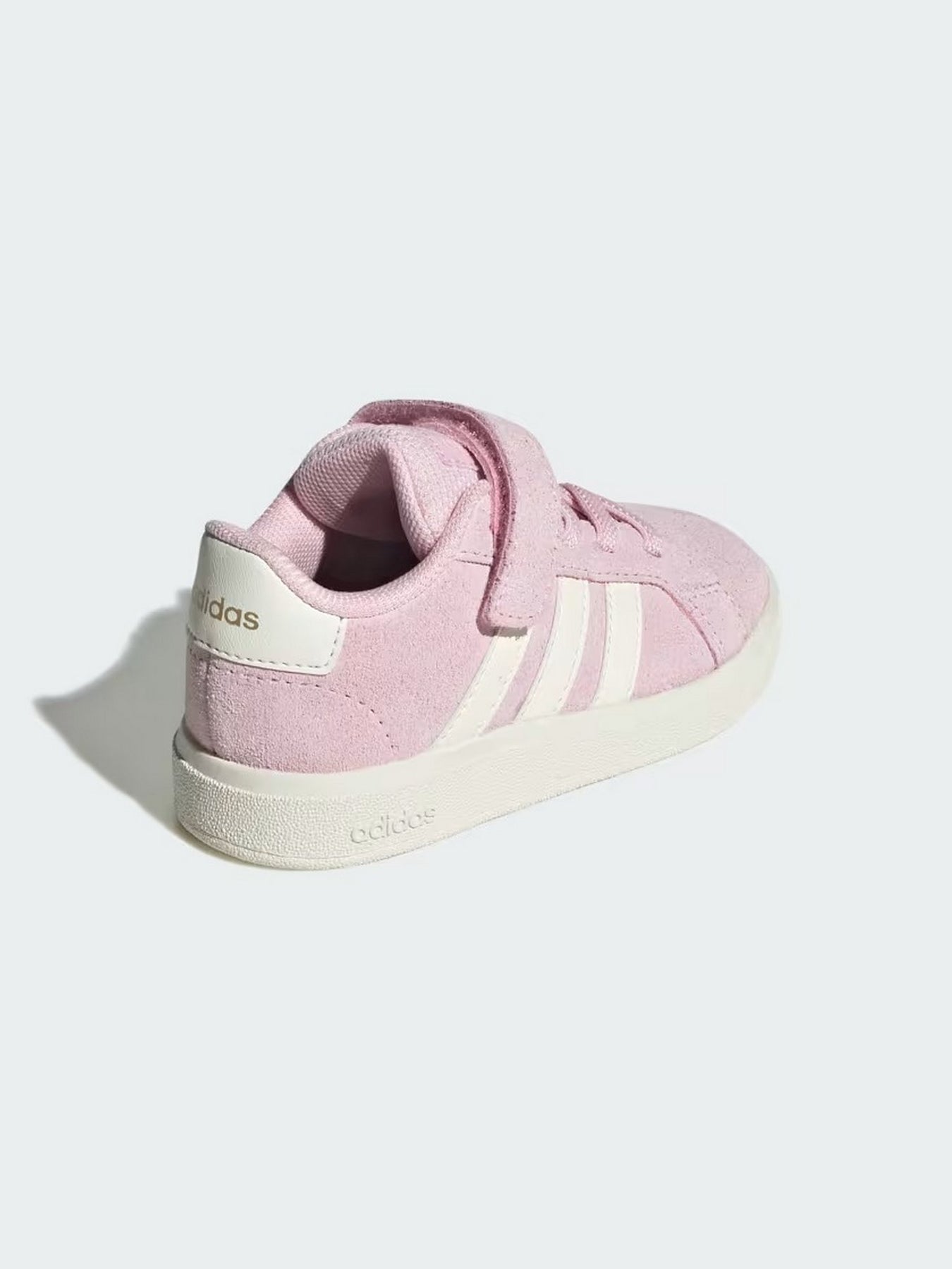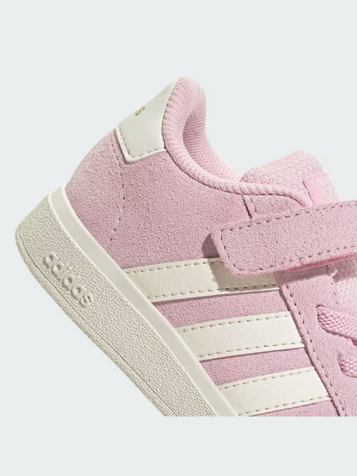 La sneaker ADIDAS Grand Court 2.0 da bambina, modello JR0781, è un'icona dello stile retrò rivisitata per i più piccoli. La colorazione rosa chiaro con dettagli off white e accenti dorati dona un look dolce ma deciso, perfetto per ogni occasione.