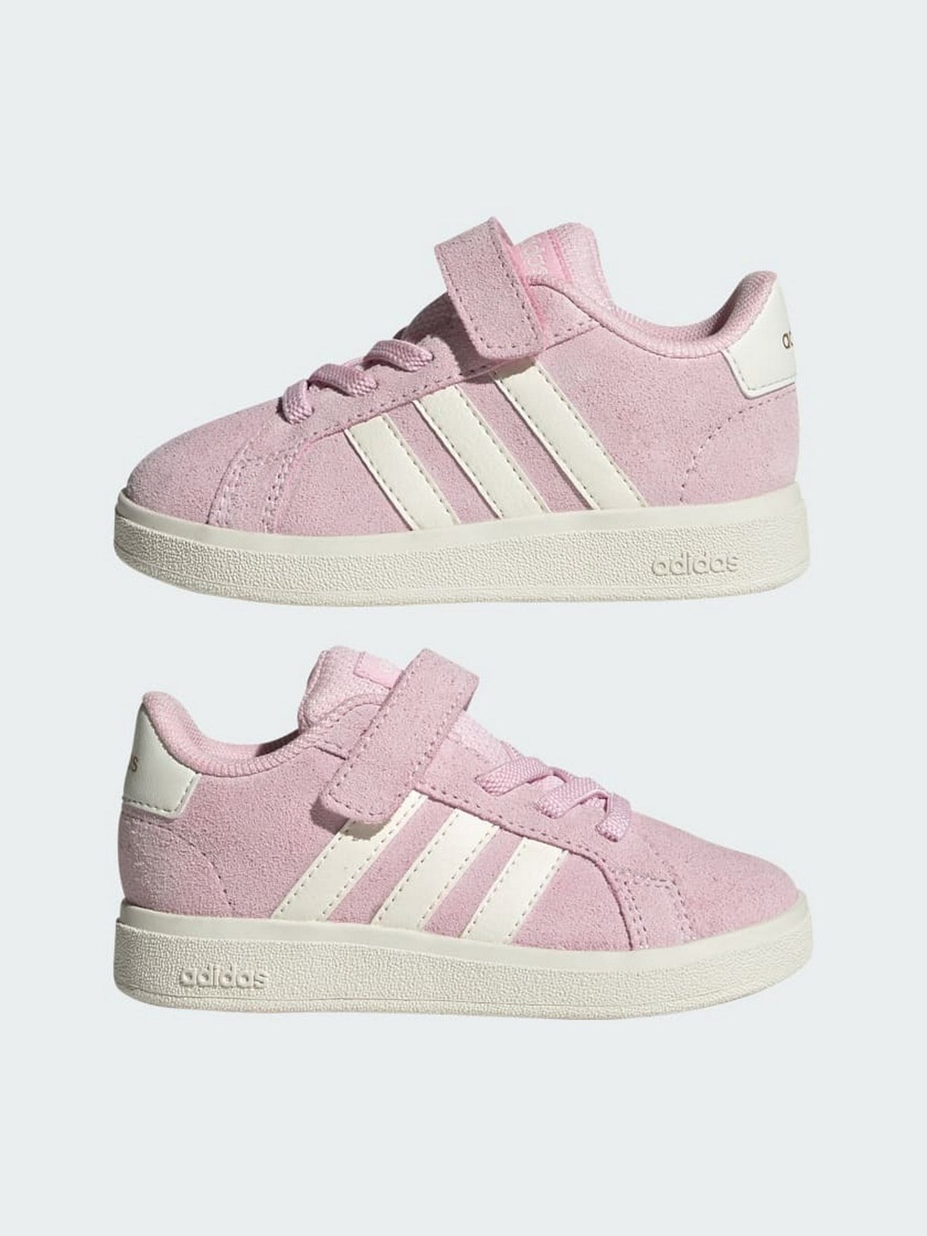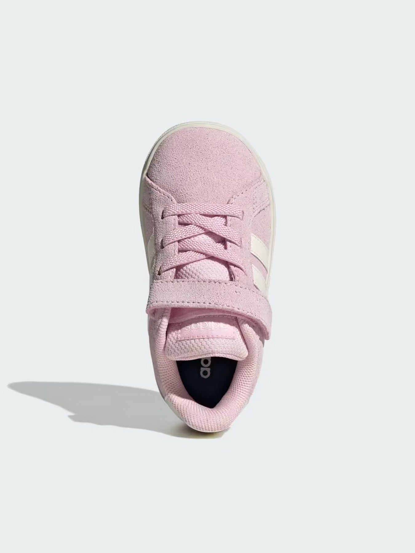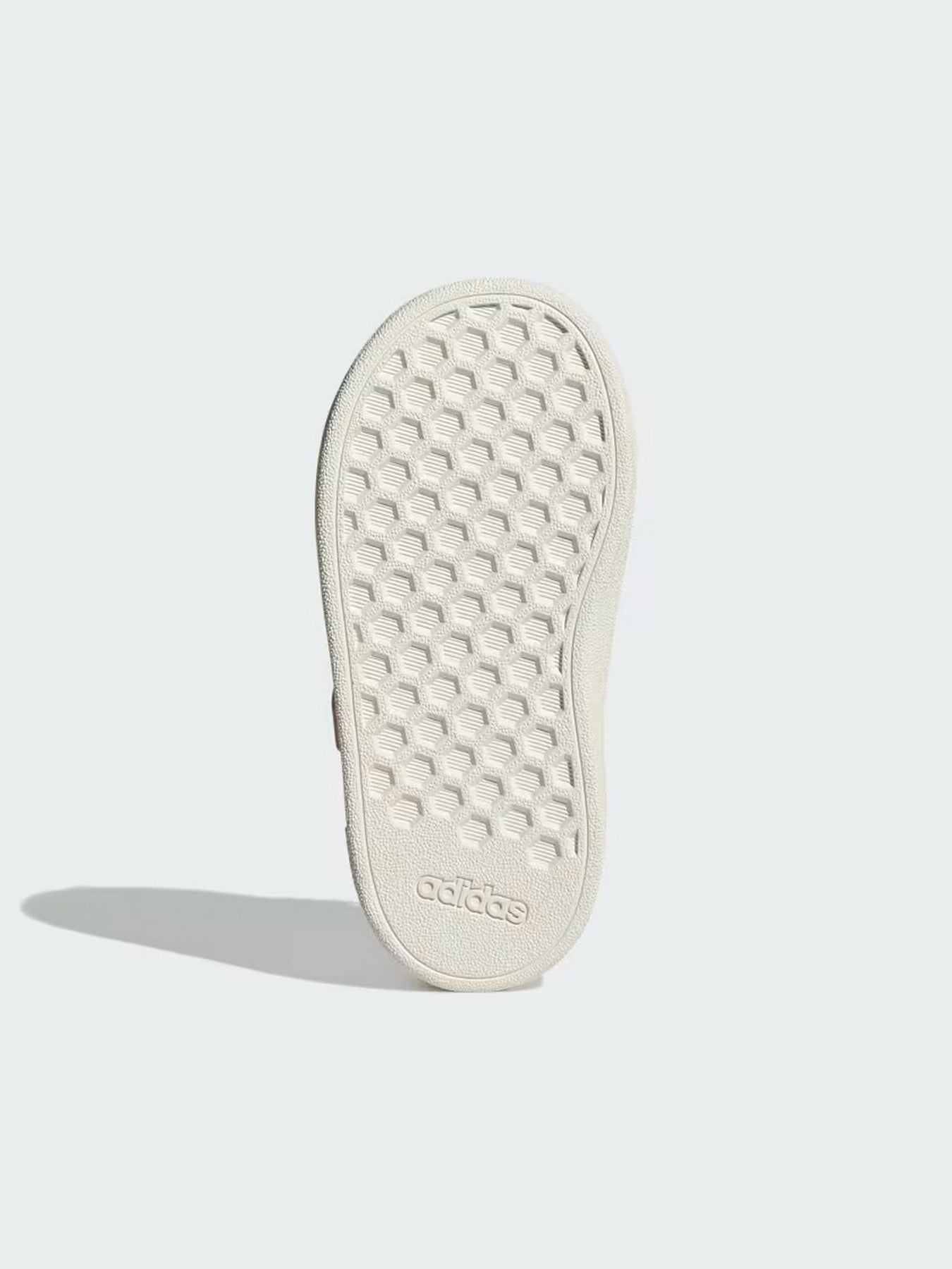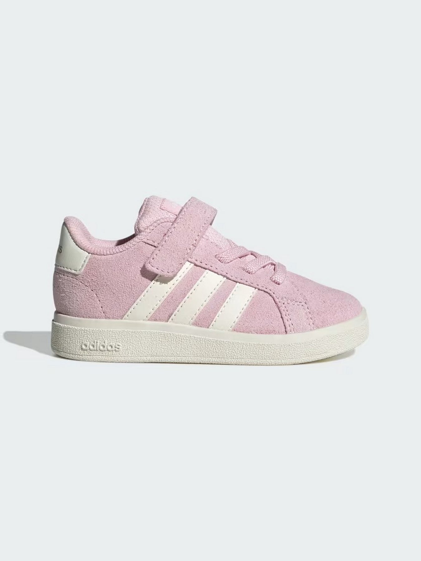 La sneaker ADIDAS Grand Court 2.0 da bambina, modello JR0781, è un'icona dello stile retrò rivisitata per i più piccoli. La colorazione rosa chiaro con dettagli off white e accenti dorati dona un look dolce ma deciso, perfetto per ogni occasione.